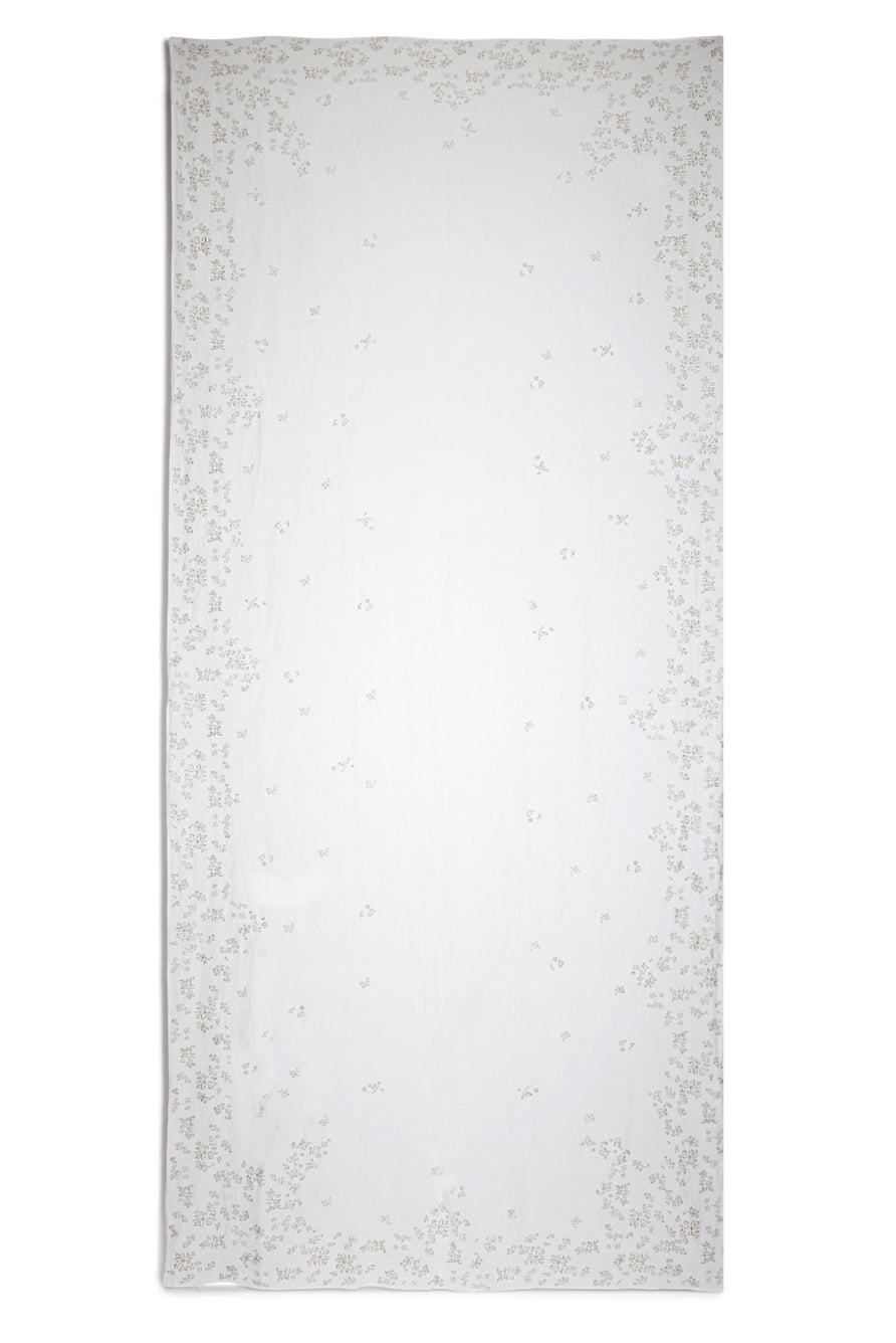 Designed to commemorate our co-founder Bernadette Bishop, this fine Italian linen tablecloth with a slightly rustic sensibility features an elegant pattern of “falling flowers” in gold stamped around its edge.