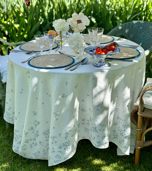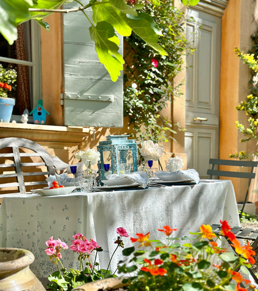 ... Read moreDesigned to commemorate our co-founder Bernadette Bishop, this square linen tablecloth features an elegant pattern of “falling flowers” in light blue around its edge.