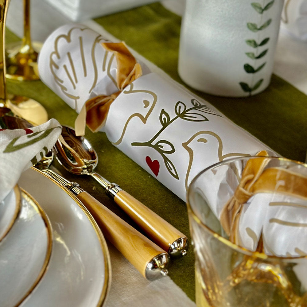 Bring a touch of joy and refinement to your festive table with our Box of Gold Doves Crackers. Each cracker is beautifully finished with a velvet bow and filled with thoughtful treats, making them as delightful to open as they are to display.