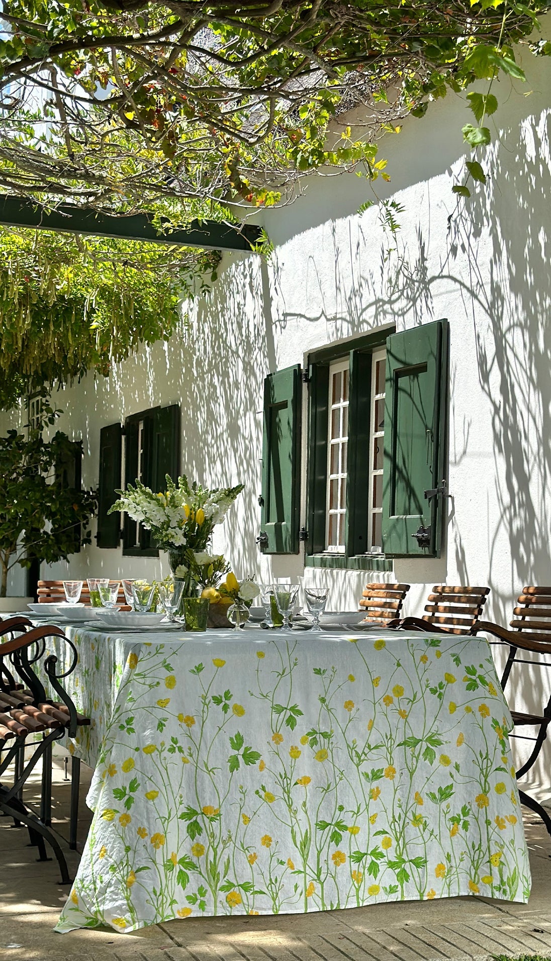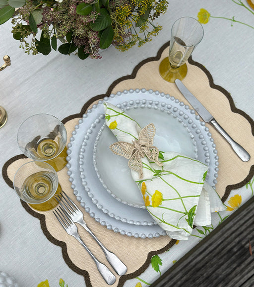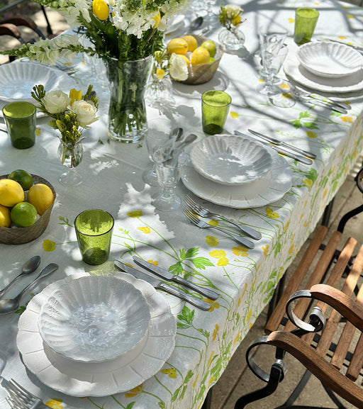 Crafted from 100% pure French linen, the Buttercup tablecloth and matching napkins offer timeless charm and versatility, effortlessly complementing any table setting, indoors or out.