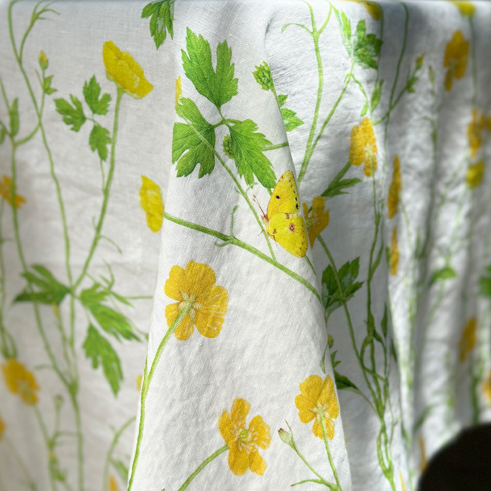 Embrace the sunshine with the joyful charm of 'Buttercup' Linen Tablecloth. Like the first golden rays of spring, the Buttercup flower brings warmth and cheer to your table. Its radiant yellow petals, vivid and playful, evoke the carefree spirit of sunlit meadows and long summer afternoons. Delightful details, such as hidden butterflies and buds, add layers of meaning, symbolising newness and growth.