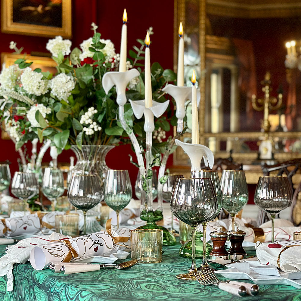 Sculptural and serene, this handblown glass candlestick takes its form from the graceful curve of a calla lily. With a delicate green and white tint, each piece is individually crafted, catching the light with natural, botanical elegance. Perfect for bringing height and gentle luminosity to your table.