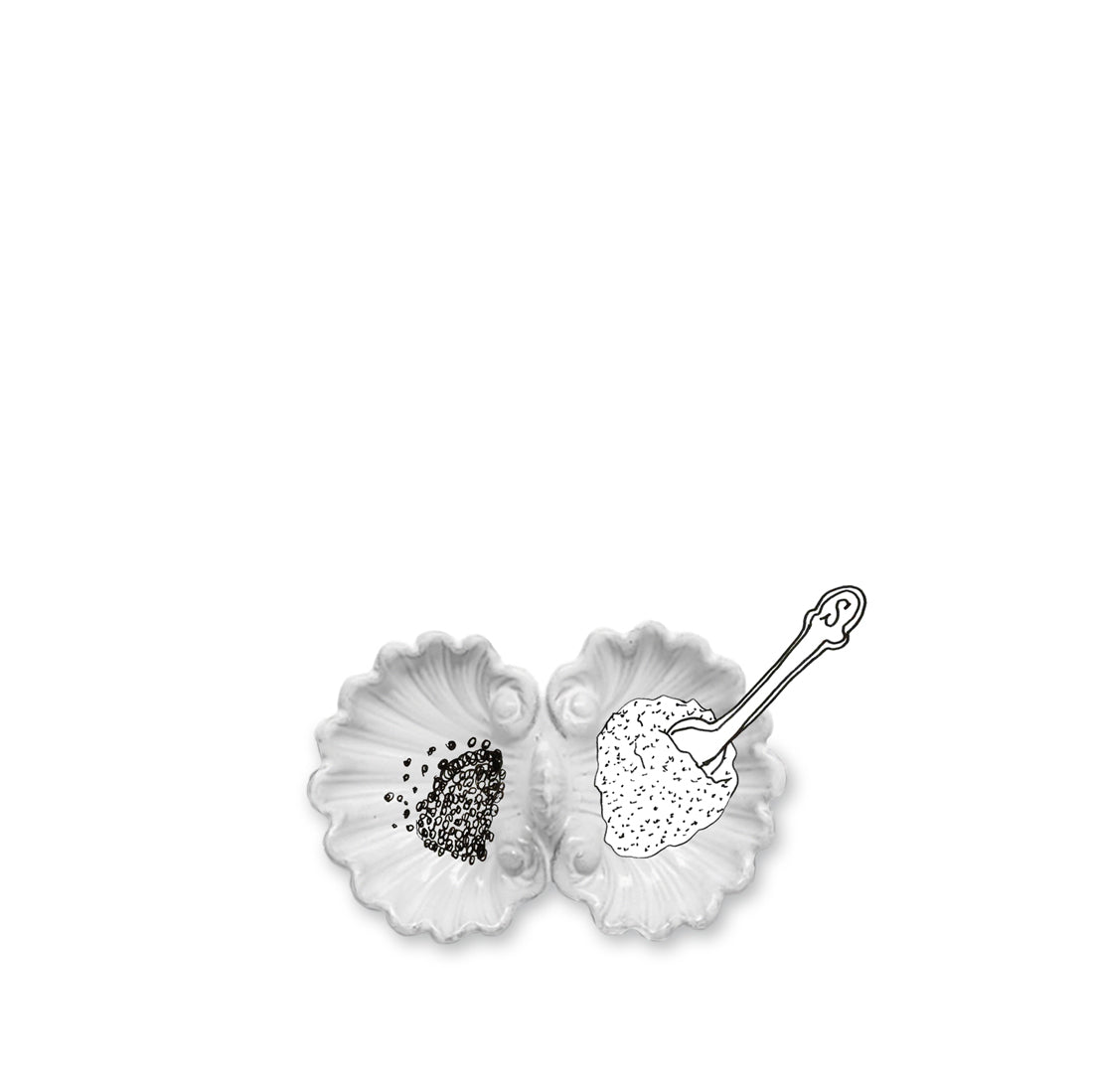 An intricate salt & pepper holder by Astier de Villatte. The ultimate, elegant finishing touch to the table.