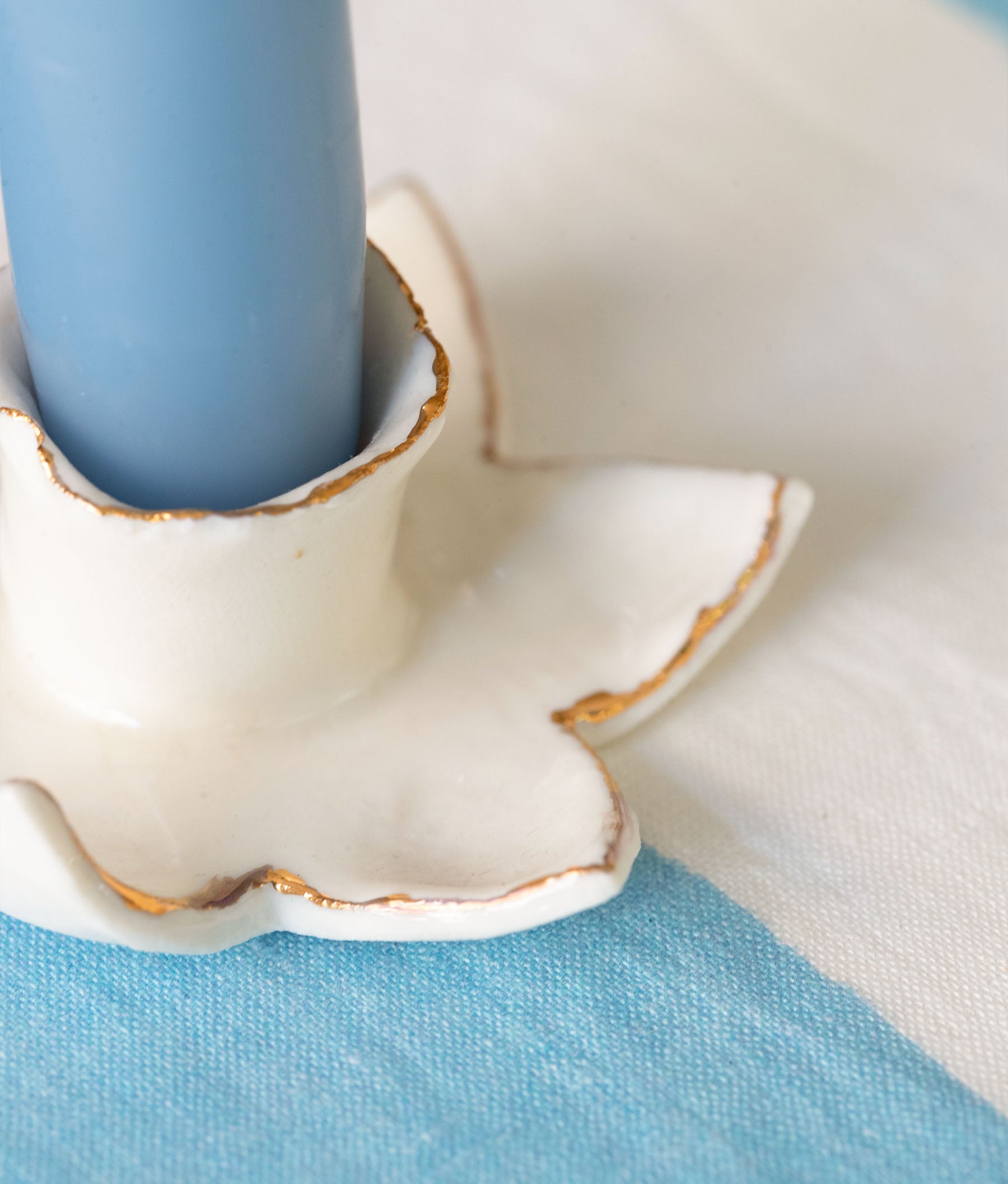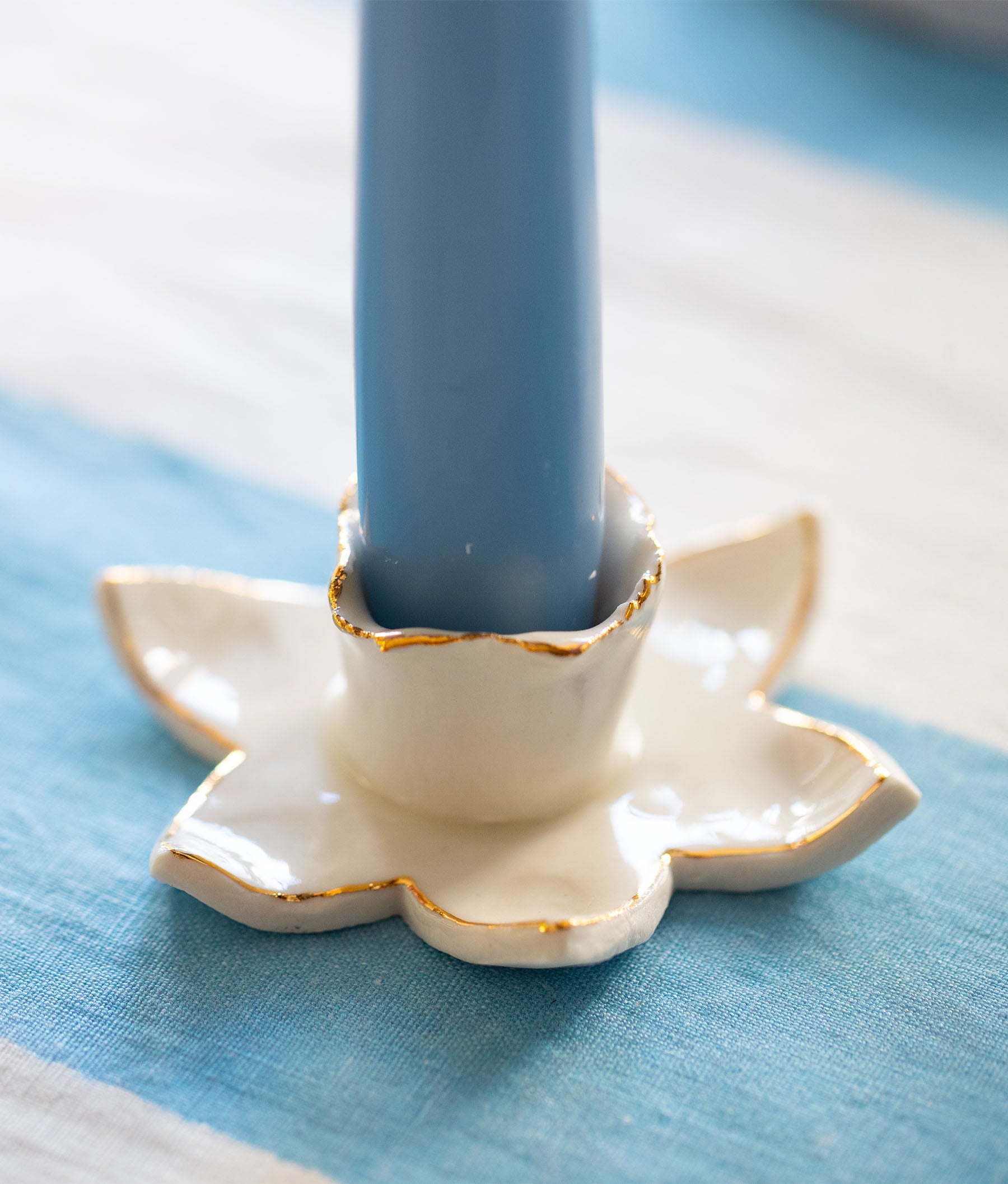 Handmade in a small studio in Notting Hill, each porcelain 'Daffodil' candle holder is finished with delicate hand-painted gold edging, adding a refined touch to your table. Beautiful on their own or paired with our hand-painted linens, these candle holders bring a hint of magic to any setting. Please note: Each candle holder is sold separately, and due to the handmade nature of the design, variations in illustration and finish make every piece truly one of a kind.