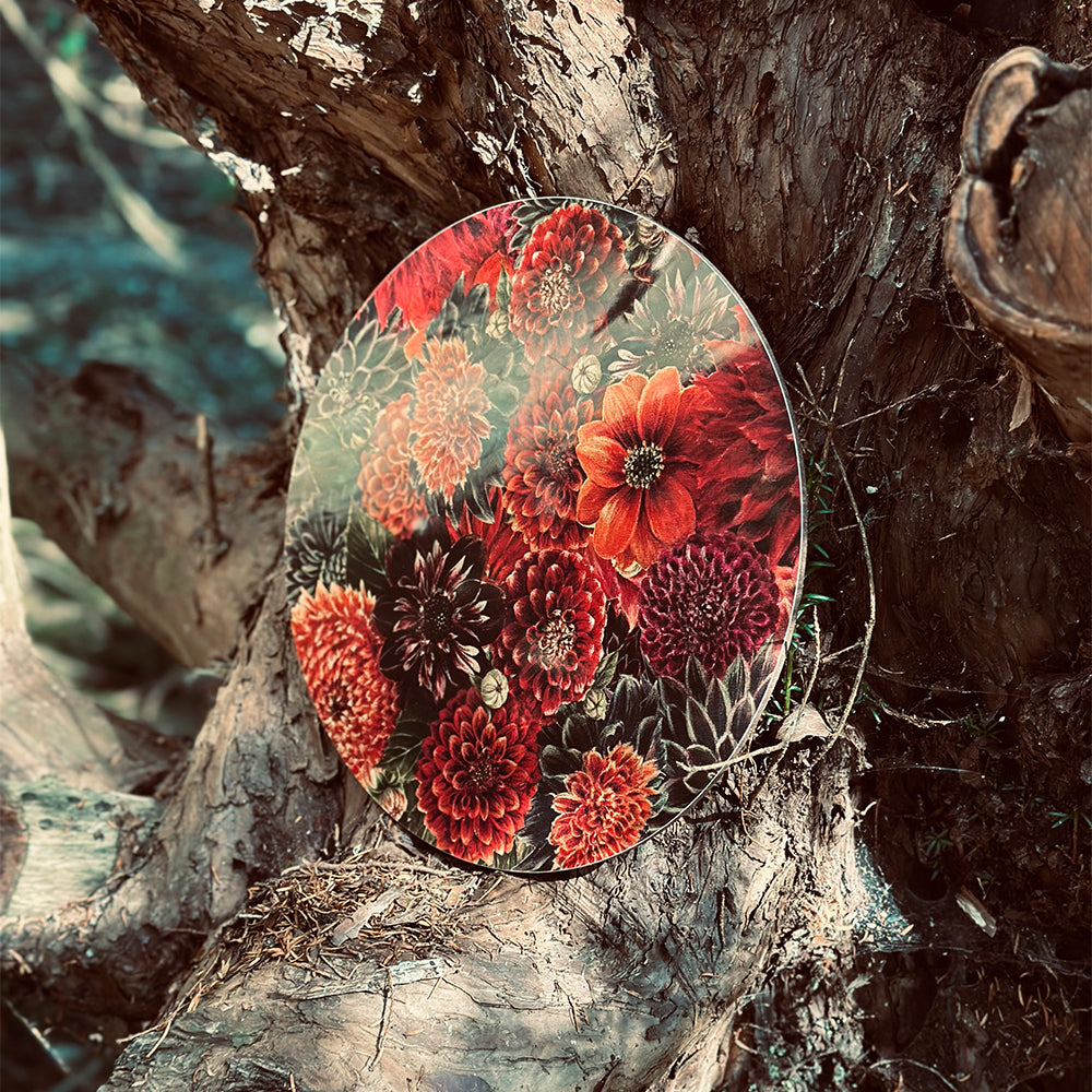 Nature’s most sculptural of flowers, the dahlia, adds definition and drama to our Autumn table settings. In rich raspberry and aubergine tones, comes a vivid study of a blooming and expressive dahlia on this cork-backed placemat.
