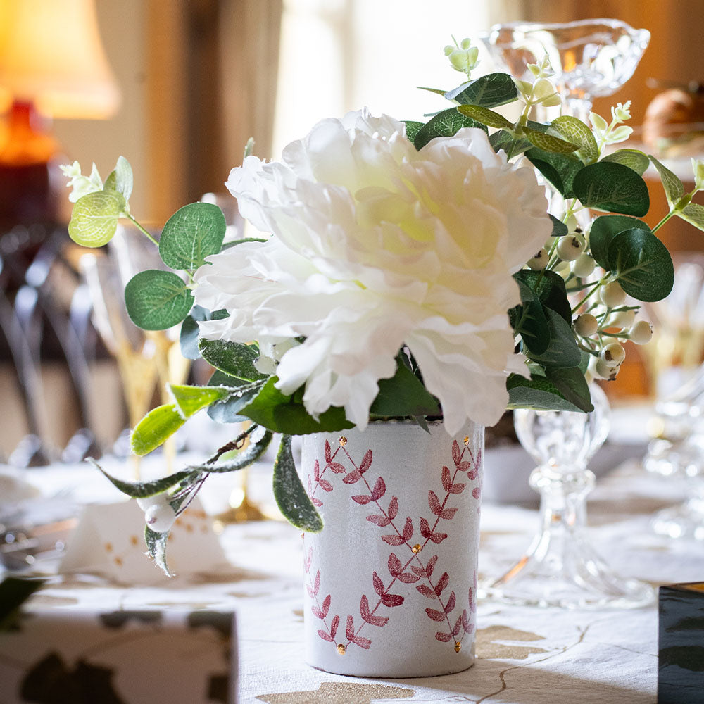Hand-painted with rich red oxide and adorned with luxurious 24ct gold leaf accents, this piece features a glossy white glaze that beautifully enhances your favorite floral arrangements. Elevate your home décor with this unique and elegant statement piece.