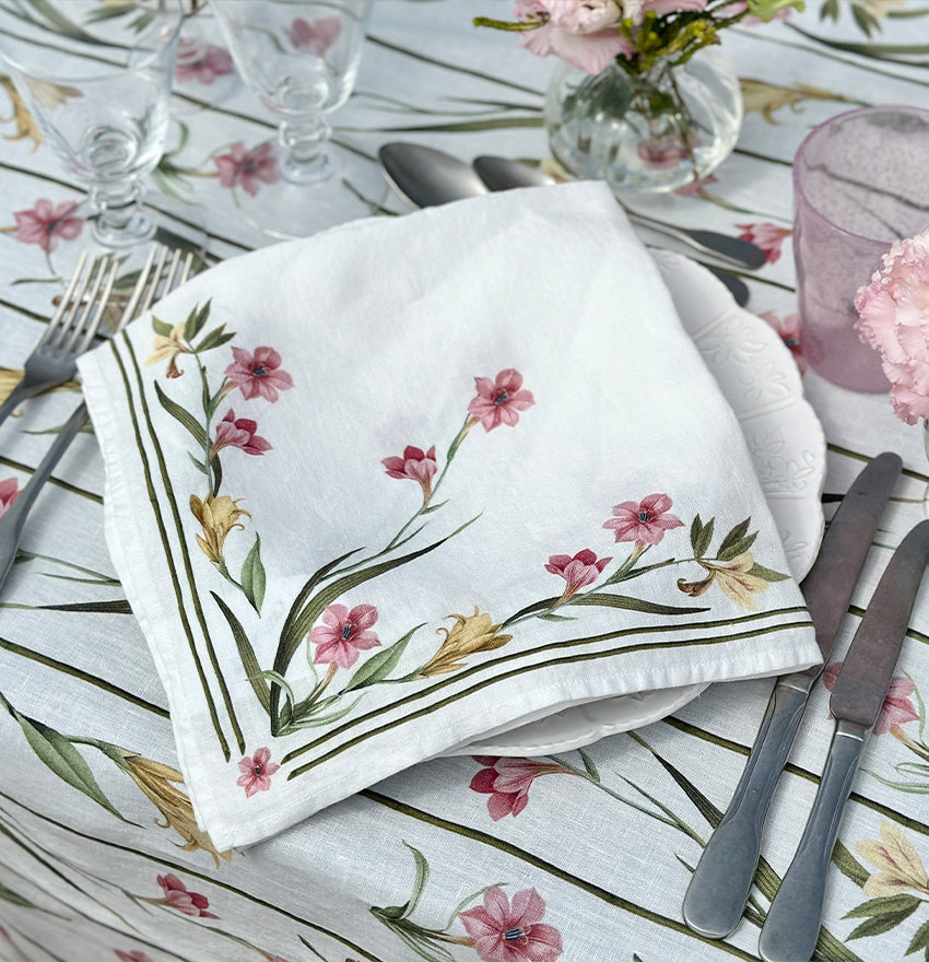 Symbolising strength and heartfelt emotion, the gladioli’s timeless beauty is reimagined with contemporary charm. Striped with delicate stems from top to bottom, the tablecloth strikes a perfect balance between softness and statement.