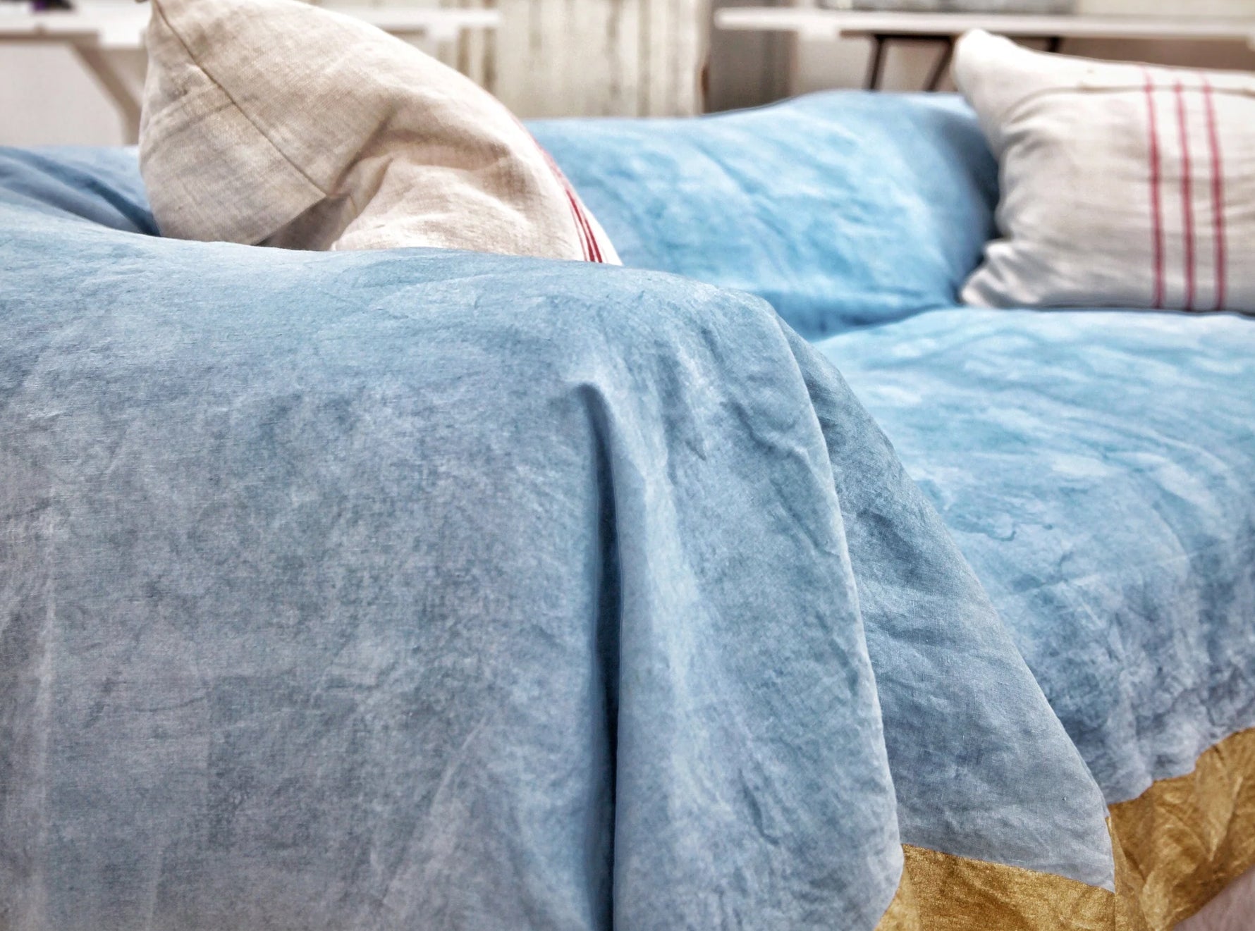 This hand painted, pale blue linen napkin with an electric gold border is made to match the tablecloth by the same name.
