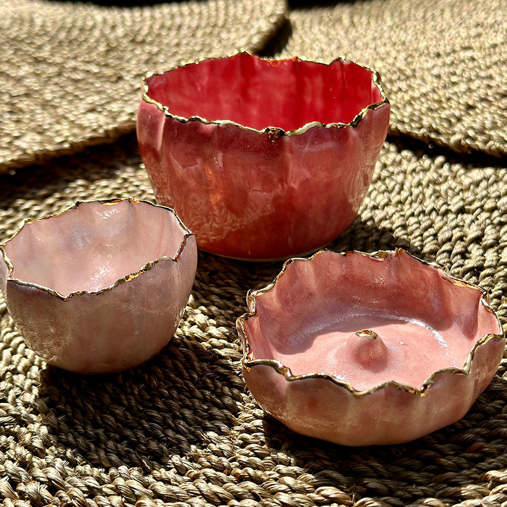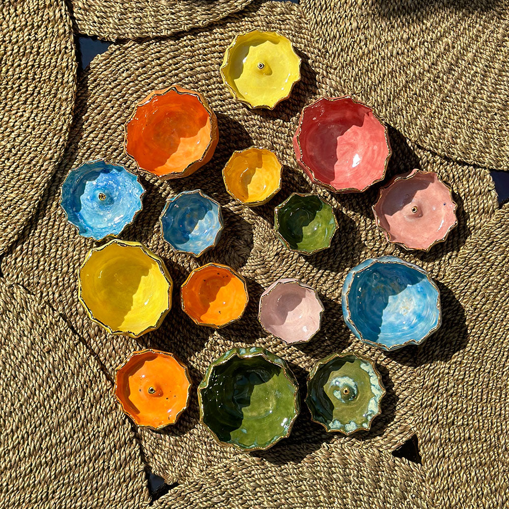 A sculptural piece of everyday beauty, this handblown burgundy glass incense holder features a delicate pinch design finished with a hand-painted 24kt gold rim. Designed to elevate quiet rituals, it brings a touch of refinement to any room whether its on a bedside table or mantelpiece.