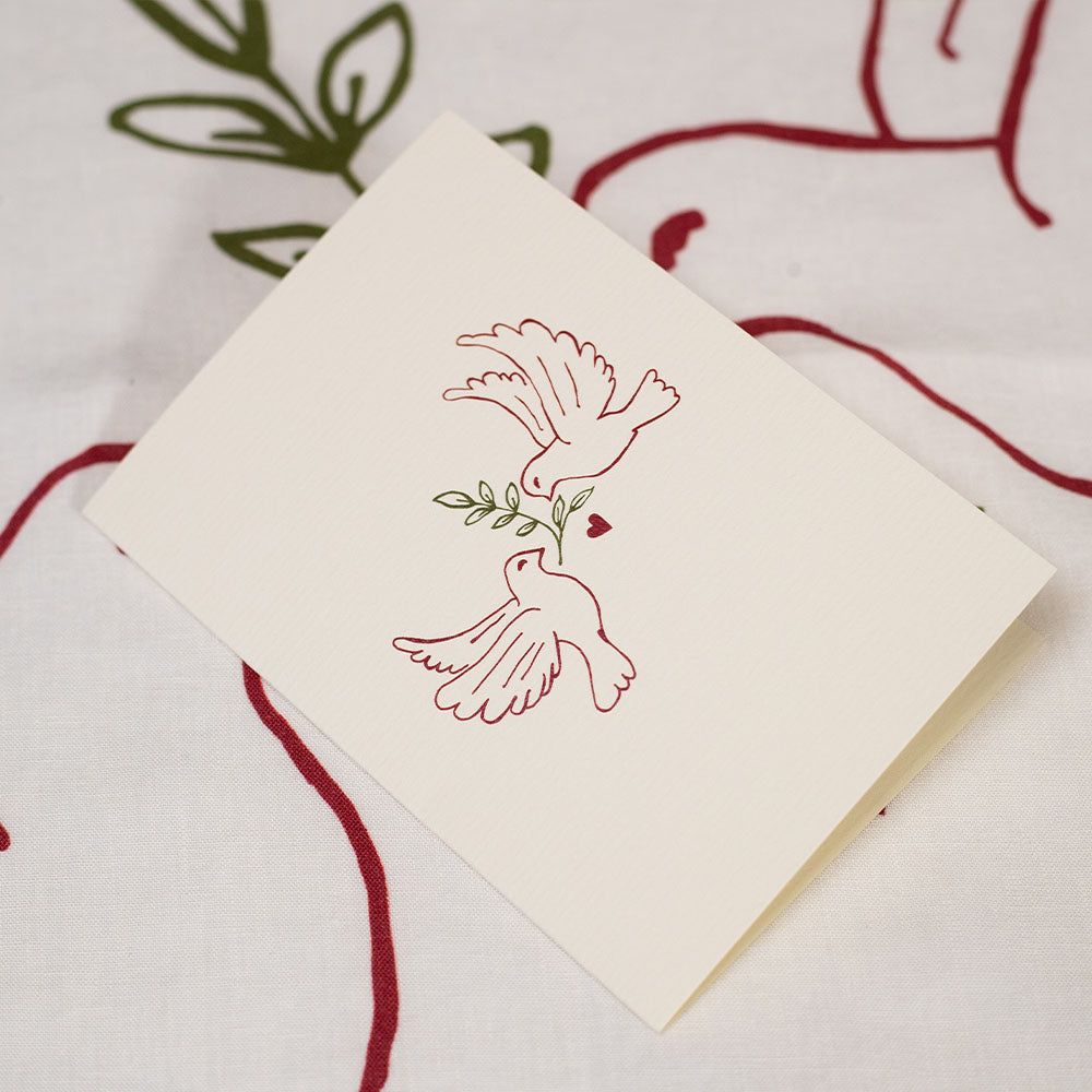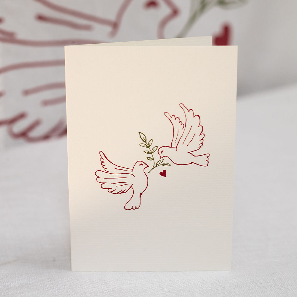 This design features our classic 'Red Doves' print – graceful doves sharing an olive branch with love.