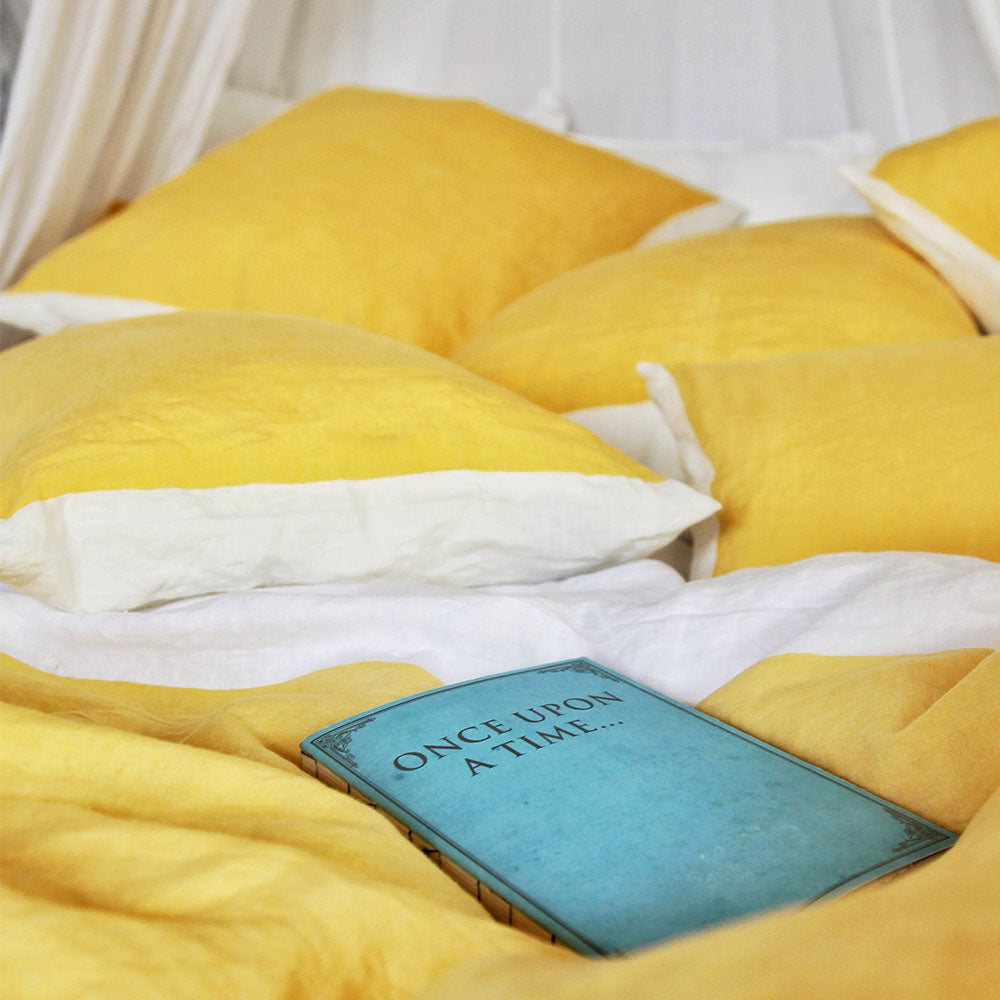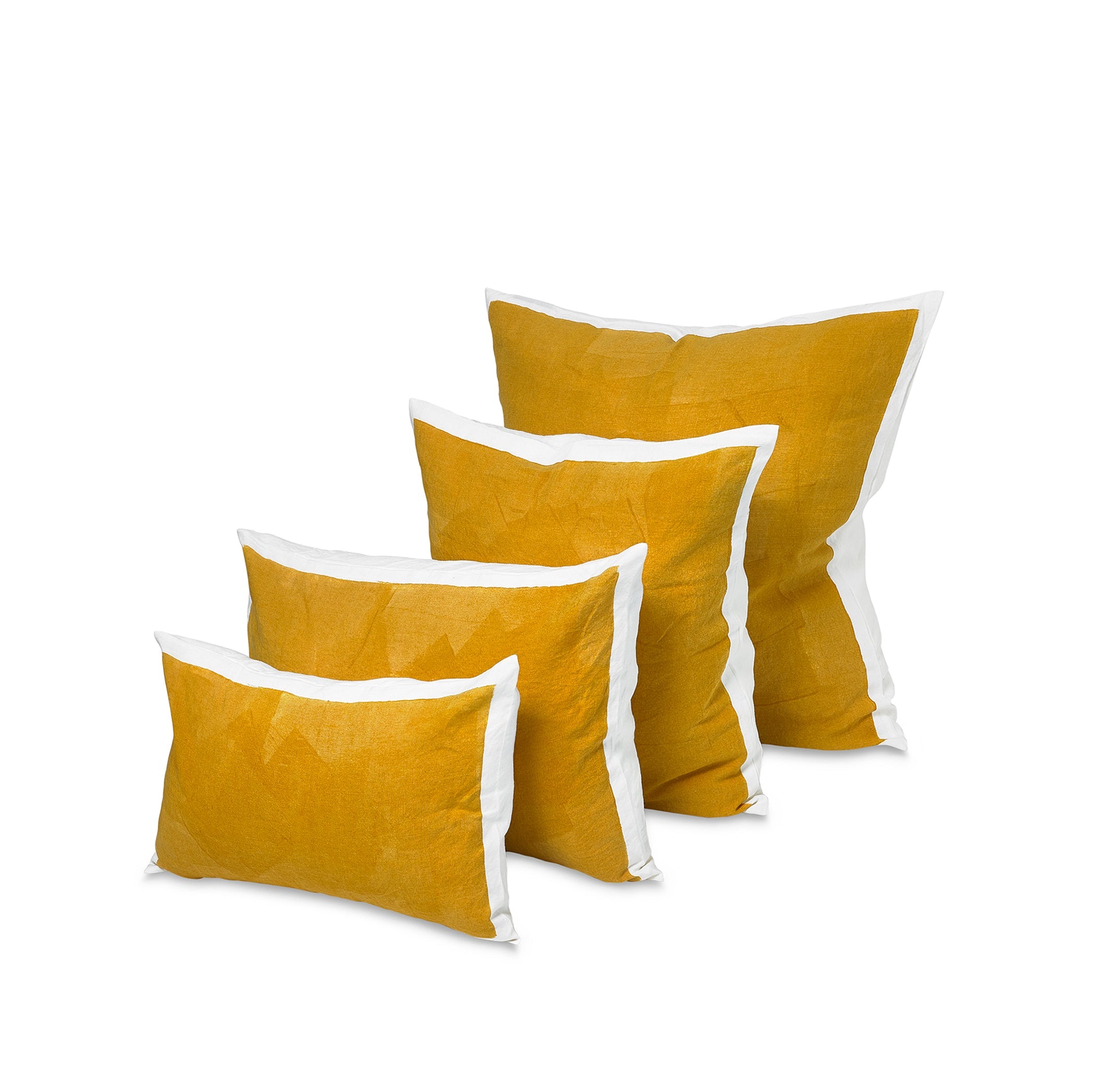 This hand painted mustard yellow cushion cover is made from 100% Italian linen.