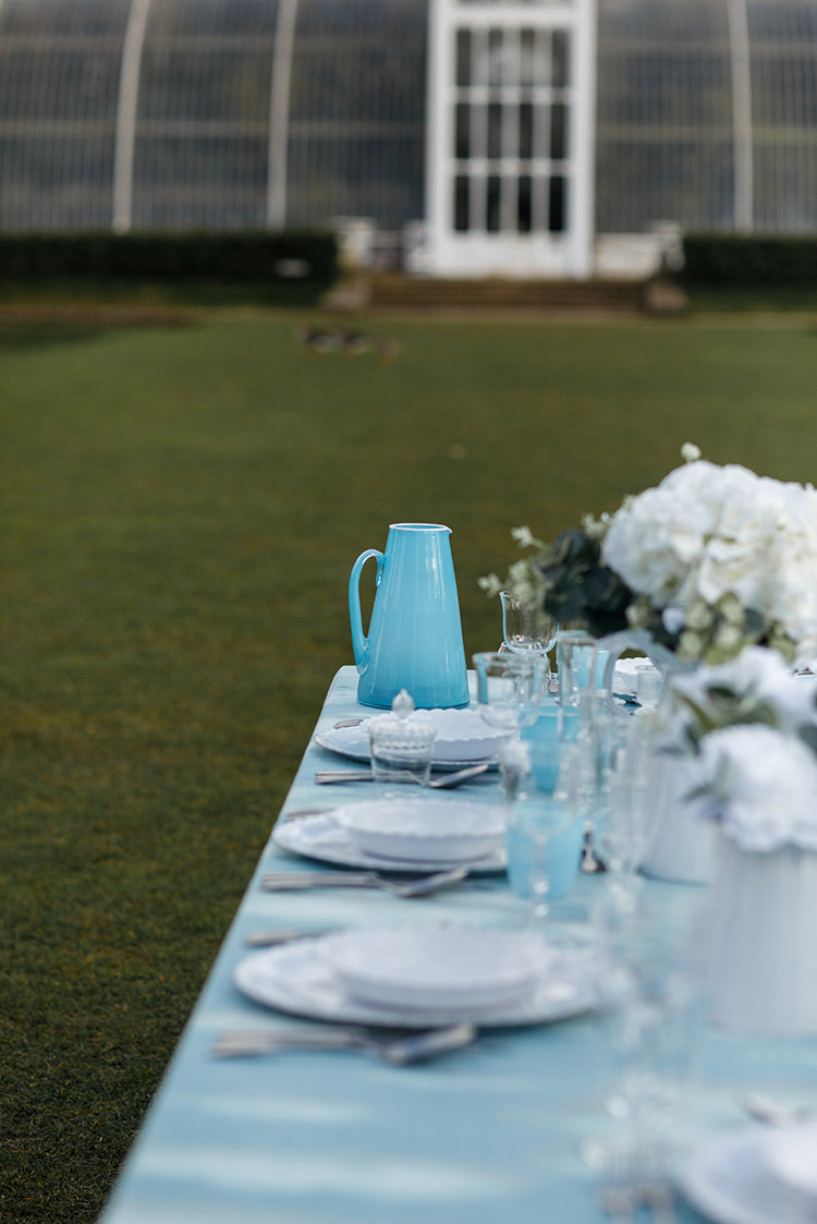 Whether for water, cocktails or flowers, our exclusive hand blown, white-rimmed jug in bright sky blue brings just the right amount of zing to the room.