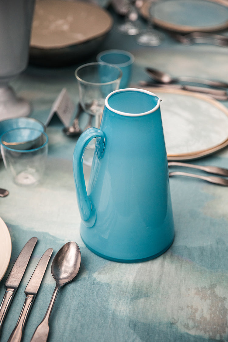 ... Read moreWhether for water, cocktails or flowers, our exclusive hand blown, white-rimmed jug in bright sky blue brings just the right amount of zing to the room.