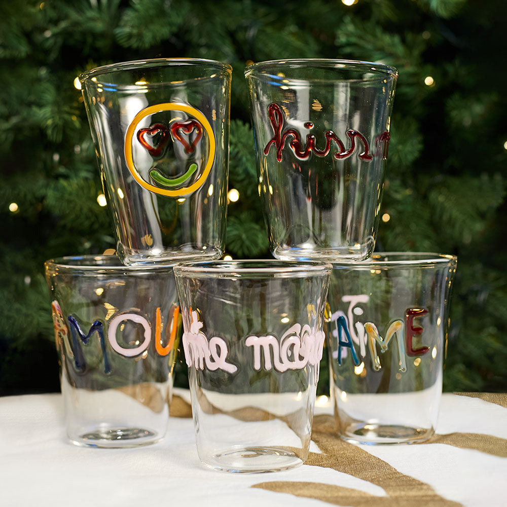 Please note: All glasses will be in multicolour and the colours chosen at random by our genius glassblower - we apologise but we cannot agree specific colours.