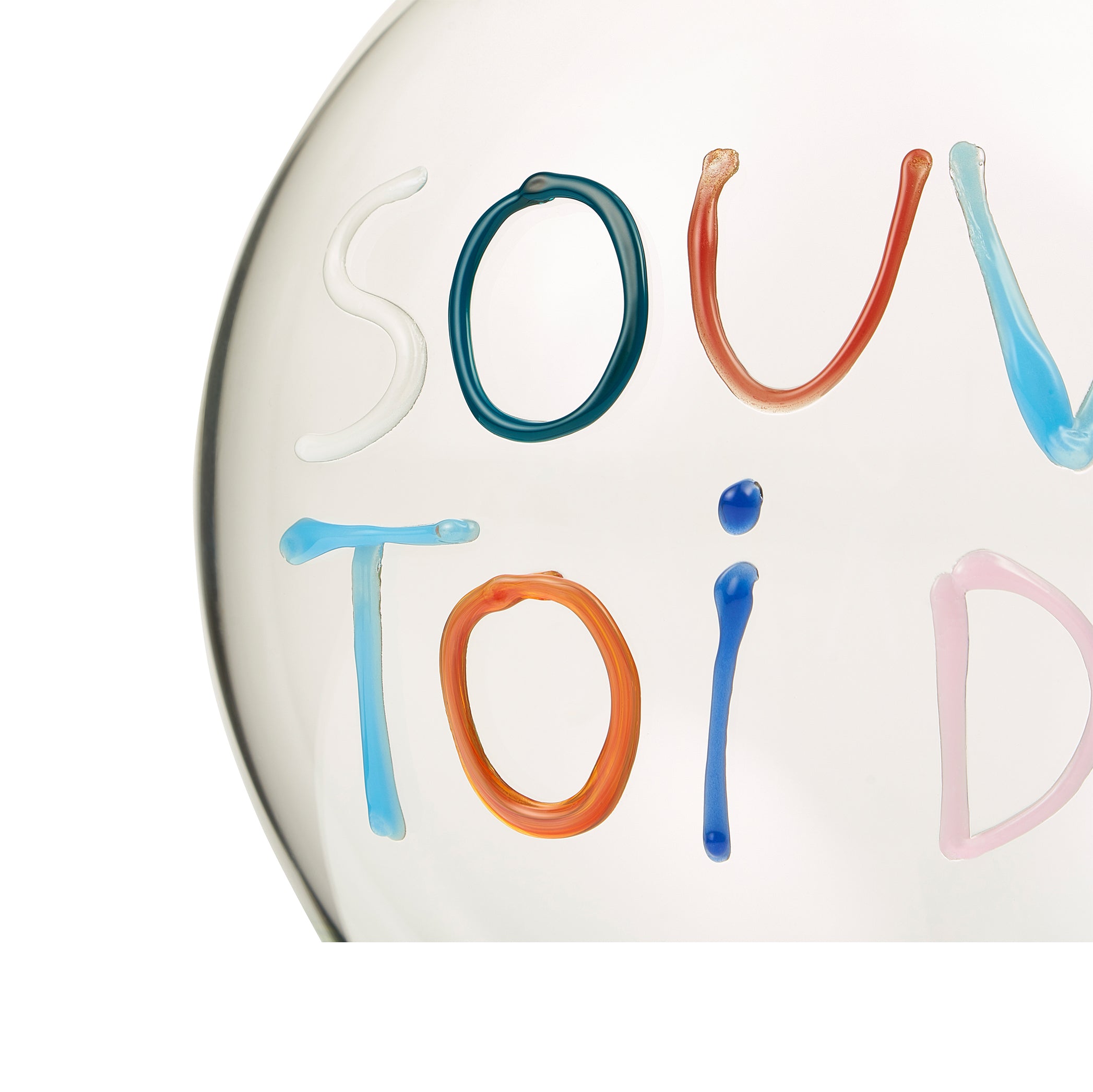 Handblown in Italy by master artisans, each carafe is uniquely adorned with multicoloured lettering.