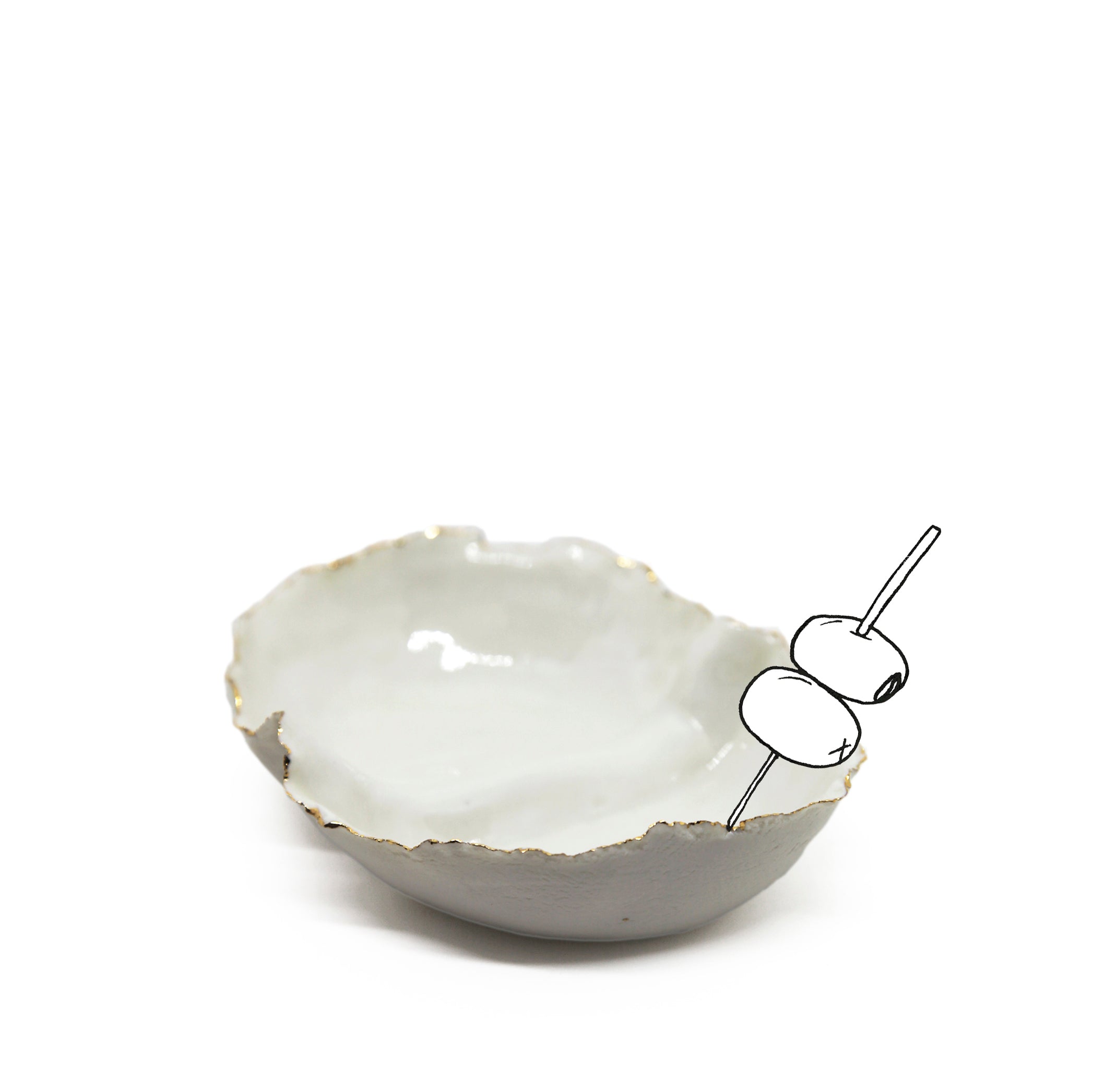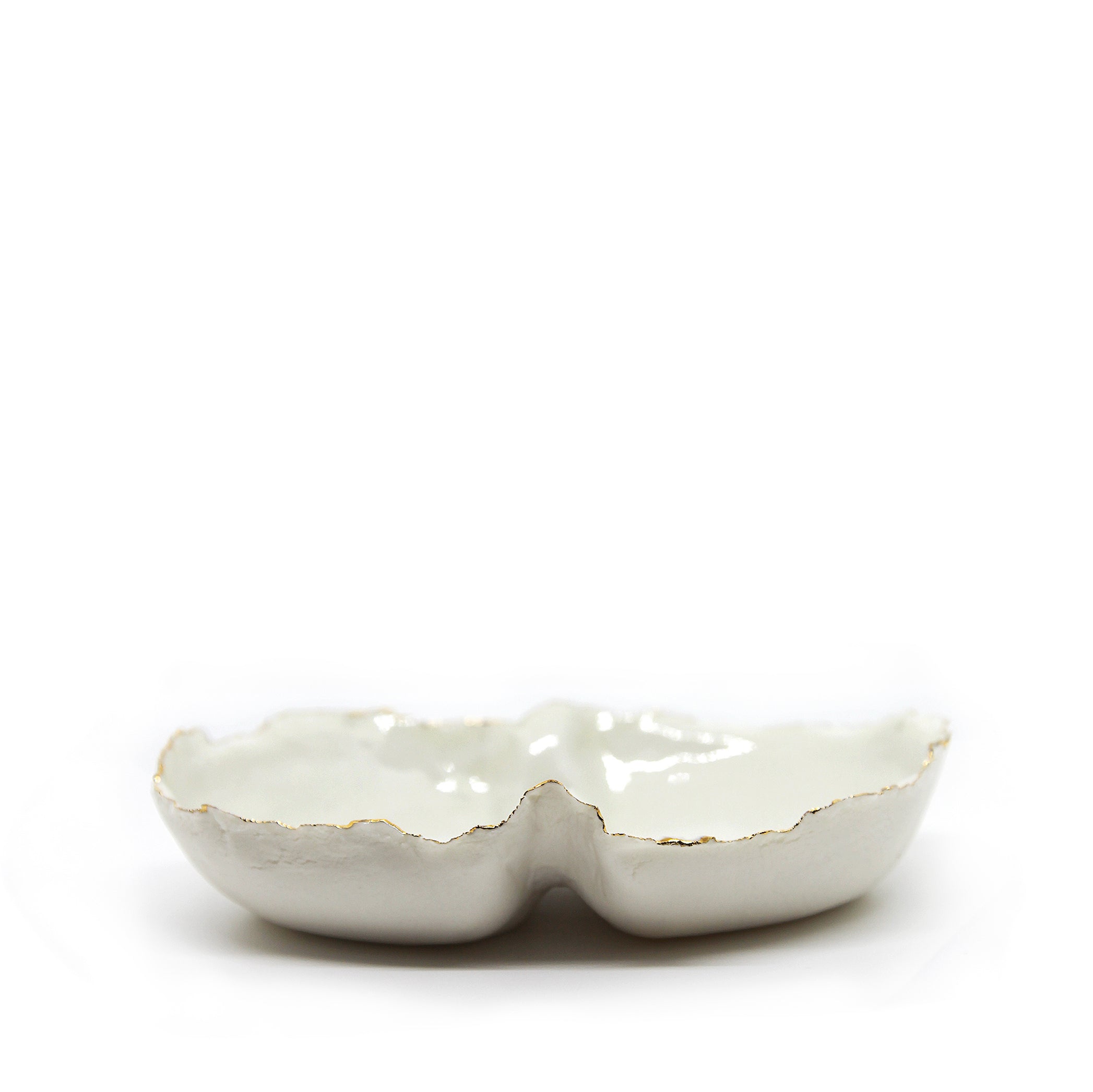 ... Read moreHandmade locally in a small studio in Notting Hill, this stunning porcelain 'olive dish' with delicate hand painted gold edging adds that final special touch to your table.
