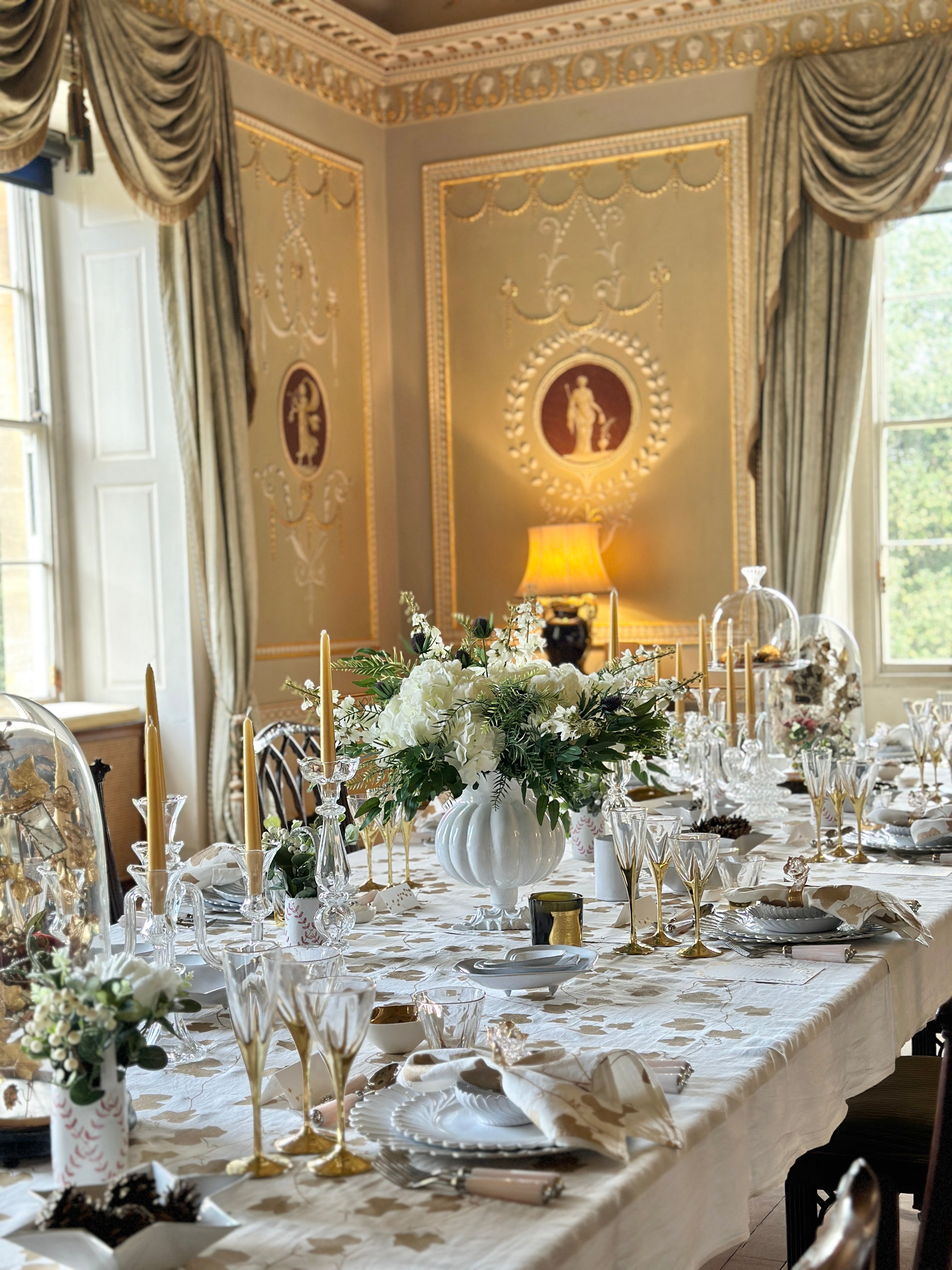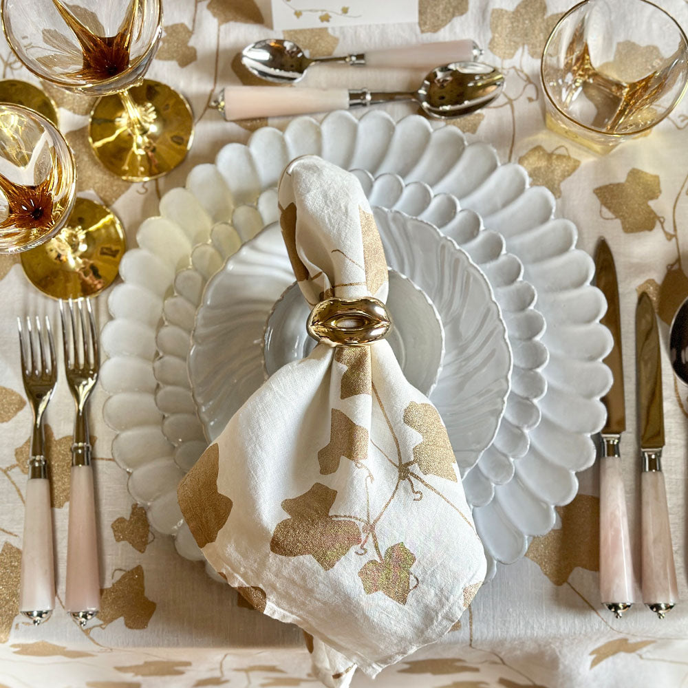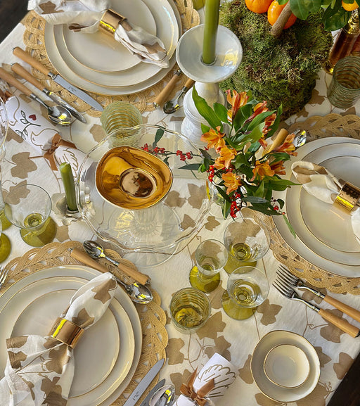 Bring effortless elegance to your table with the Ivy Gold Linen Tablecloth. Screen-printed with delicate ivy motifs in shimmering gold, it evokes the quiet beauty of nature while adding a subtle, refined sparkle to your dining setting.
