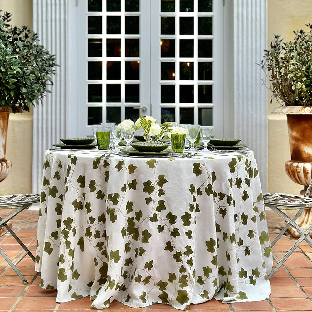 Crafted from 100% pure French linen, the Ivy round tablecloth and matching napkins offer timeless charm and versatility, effortlessly complementing any table setting, indoors or out.