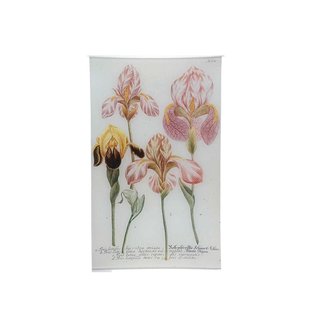 A rectangular glass tray with beautiful pale pink English Iris flowers. Delight at this reproduced decoupage print, originally sourced from Germany which dates back from the 18th century.