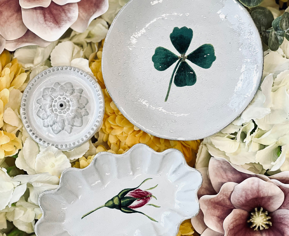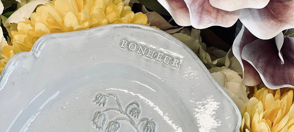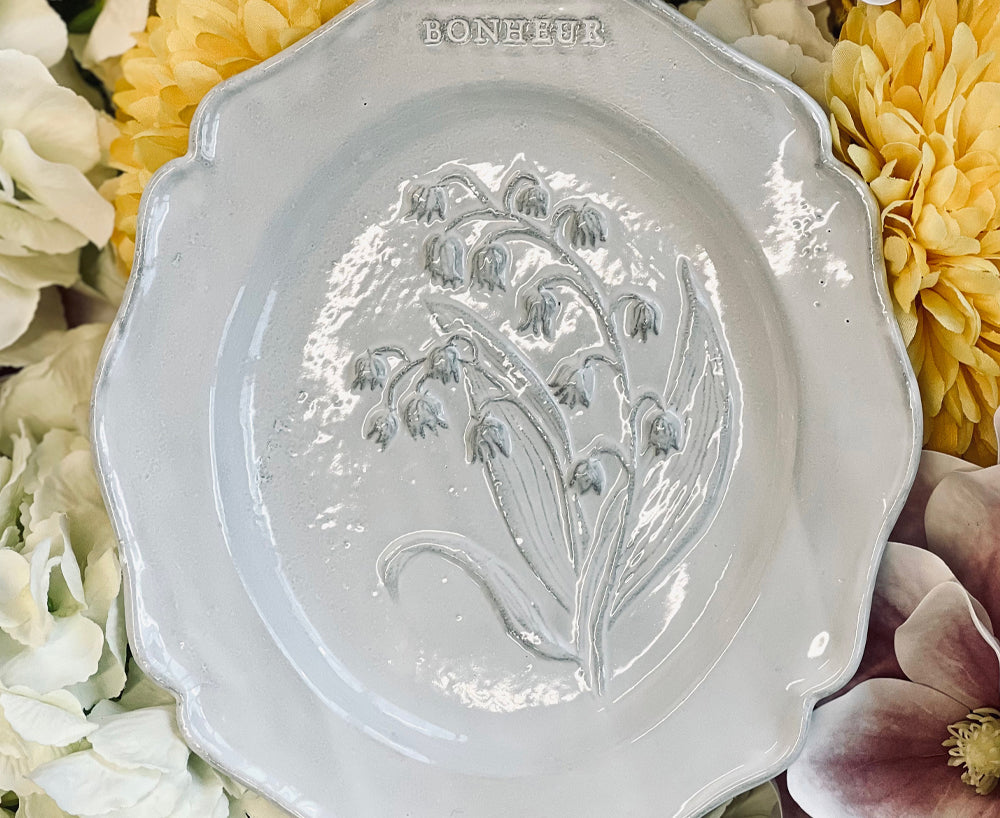 With its delicate embossed lily of the valley flower motif, this Astier de Villatte ceramic dessett plate certainly makes a statement as a serving dish or decorative piece for the table or mantle.