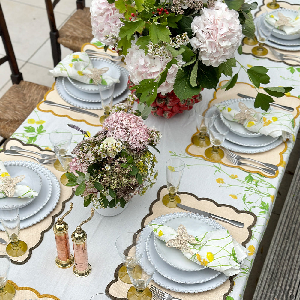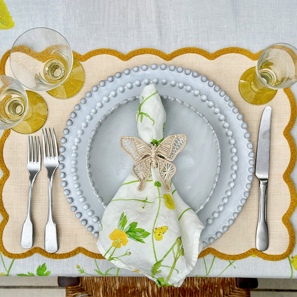 A joyful addition to any setting, the 'Lola' Placemat in Yellow pairs embroidered scalloped edging with a practical liquid-resistant backing. Made from a blend of durable fibres, it's light, elegant and made to last.