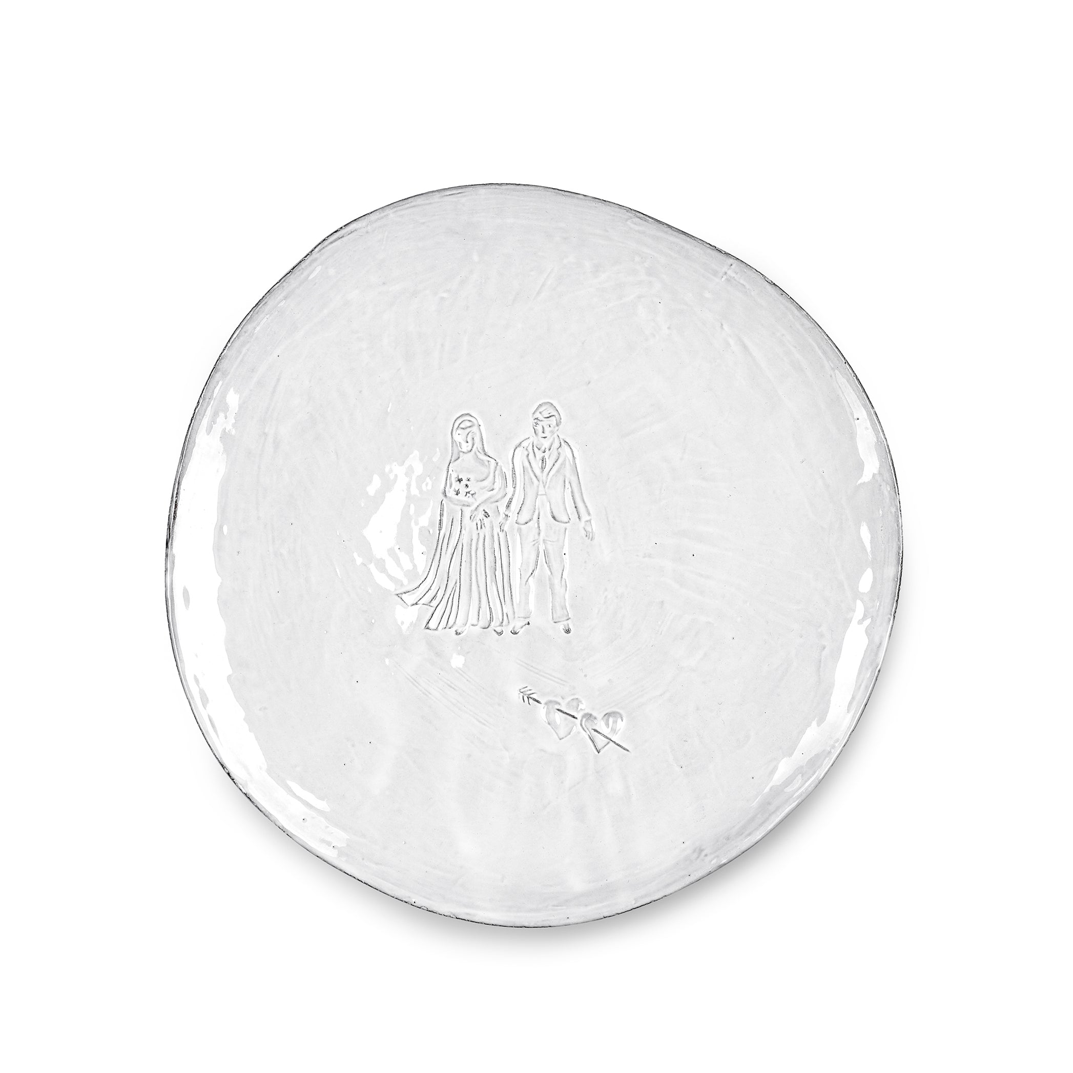 This simple platter with a delicate bride and groom at its centre makes for an elegant wedding gift.