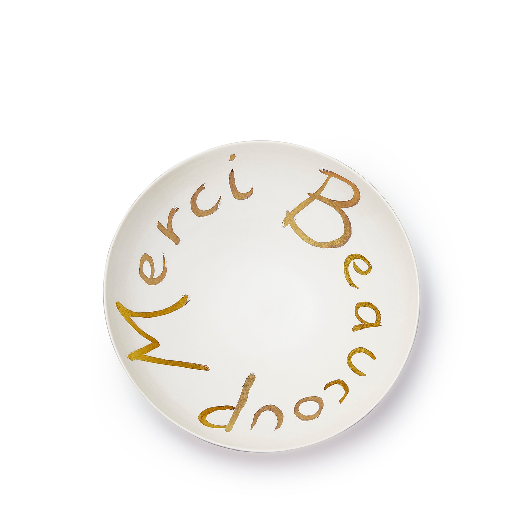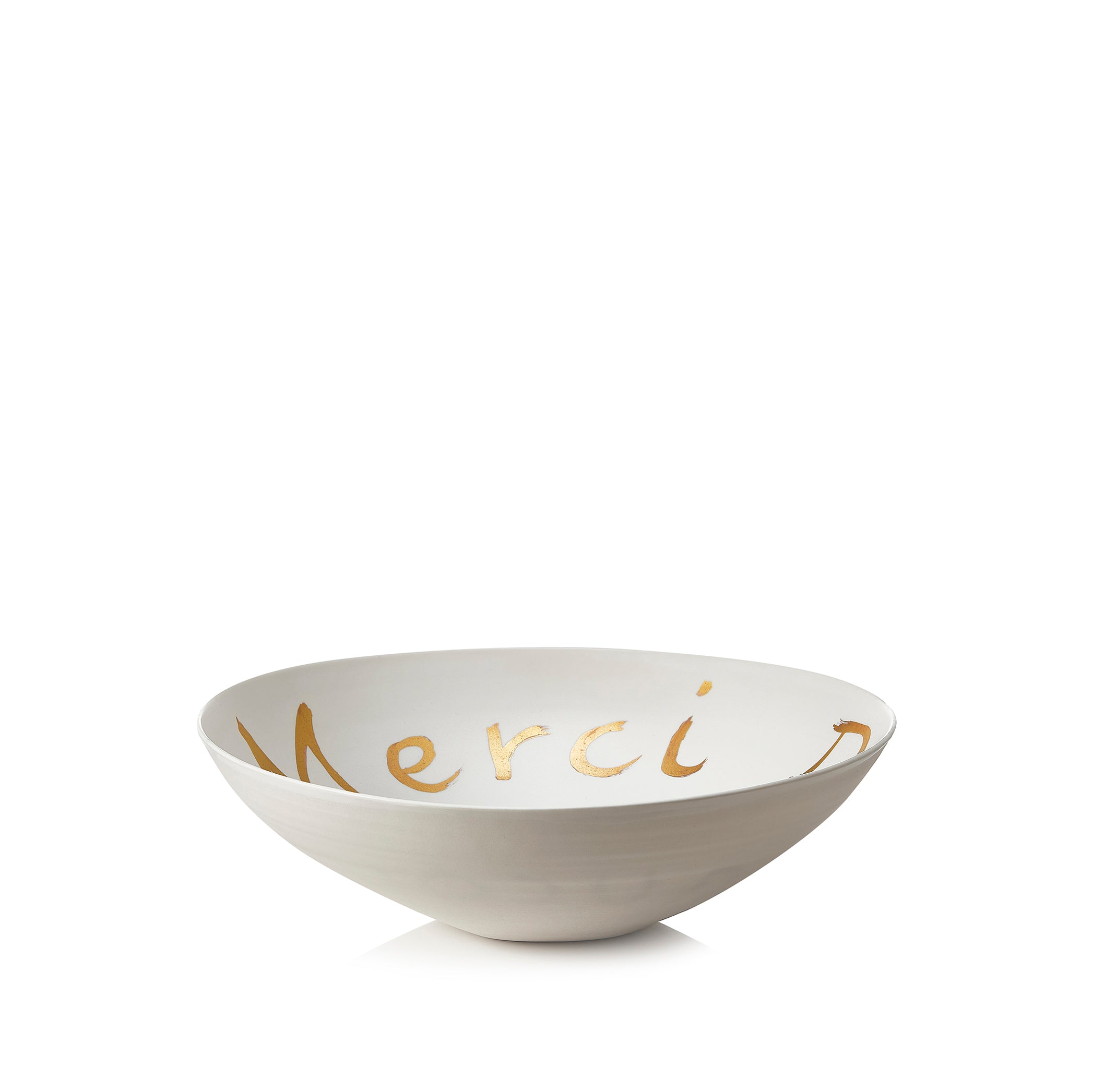 Created using a matte porcelain, the joyful French phrase “Merci Beaucoup” has been painted inside in a gold glaze making a special keepsake to give or keep forever.