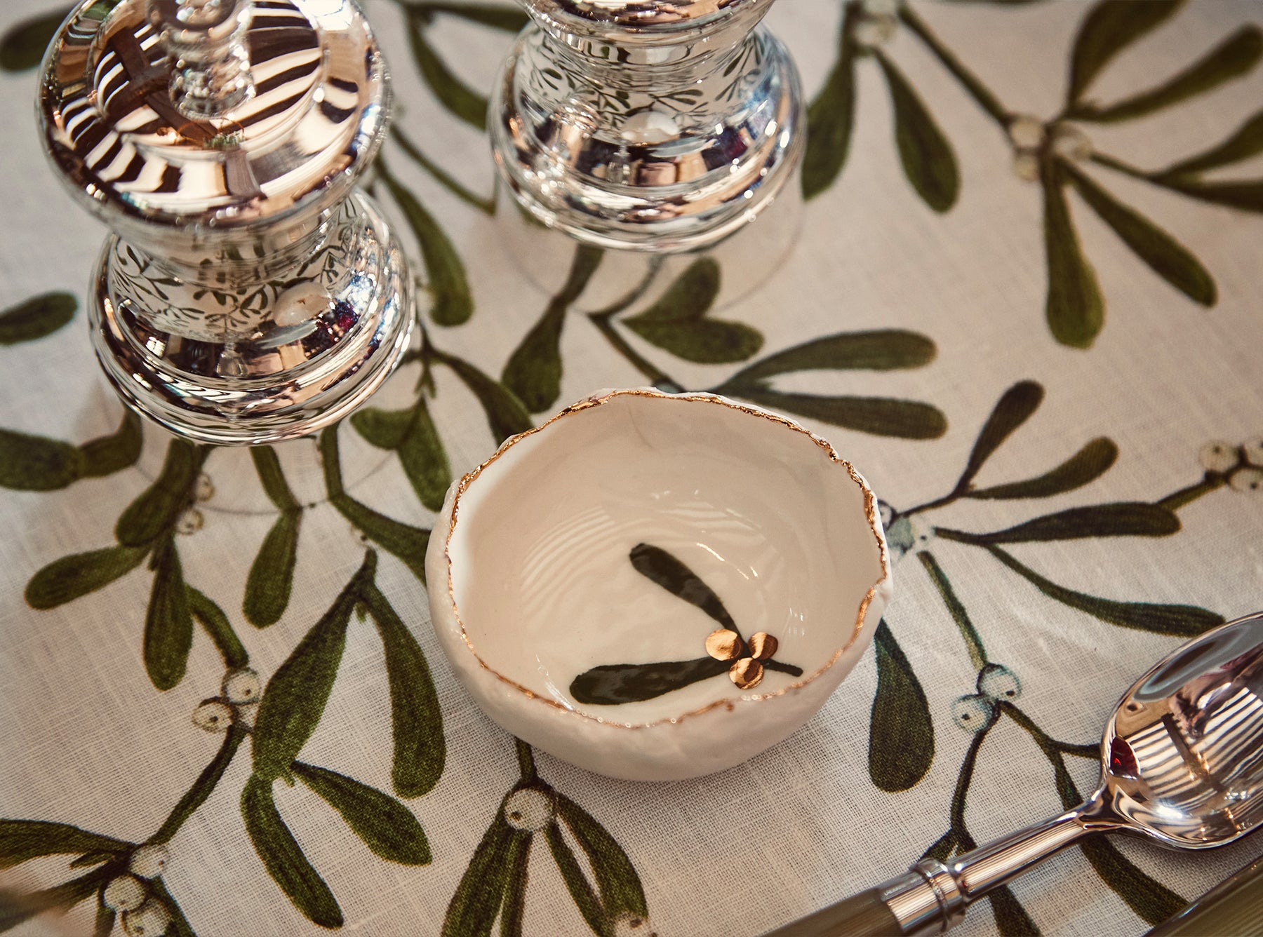 Once upon a time, on an S&B table set for Christmas, there prospered a plant called mistletoe. Garlands of evergreen branches and white berries are brought together by a festive red bow at the heart of the design.