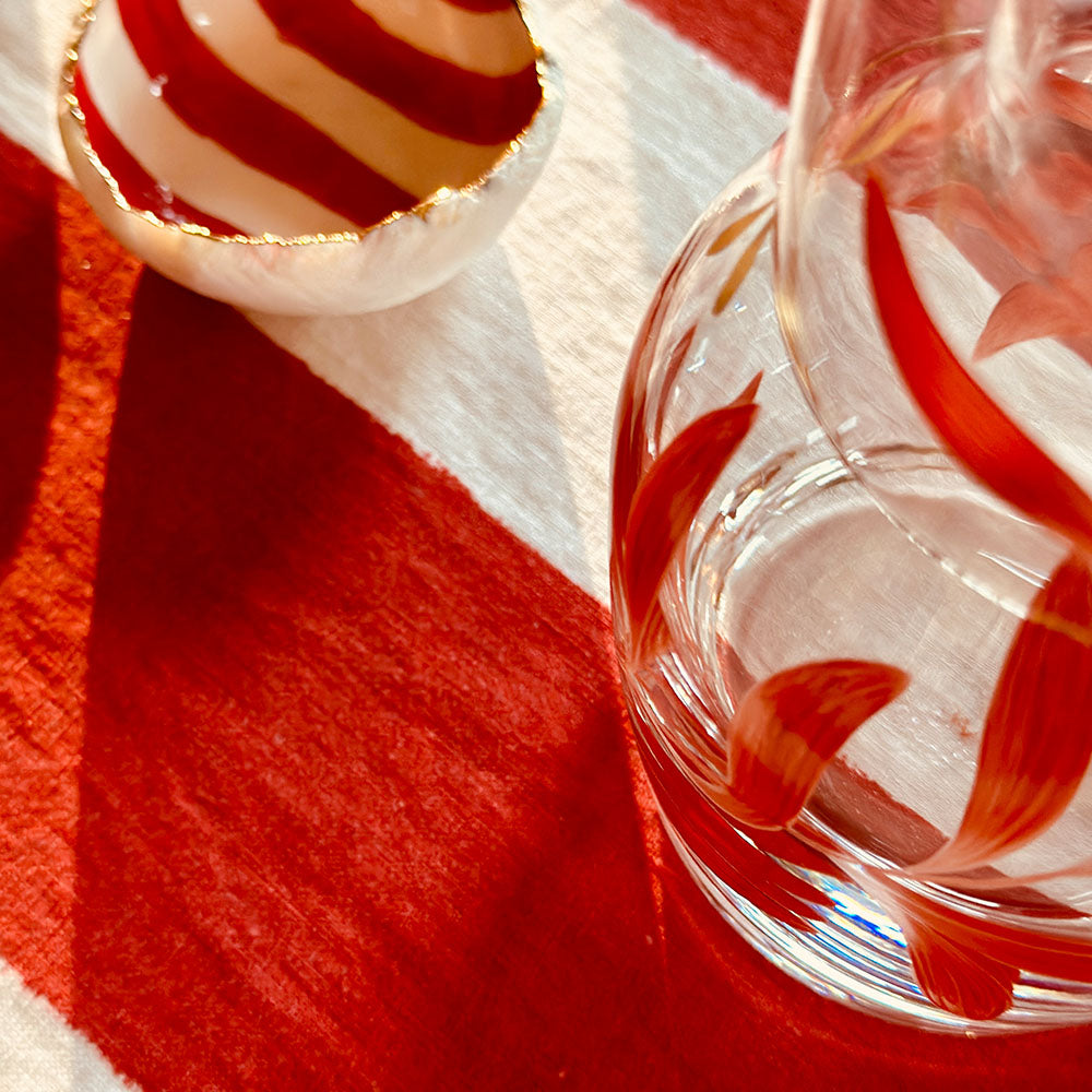 Beautifully crafted in burgundy glass, this hand-finished bedside carafe and matching tumbler are adorned with a 24kt gold dragonfly, a symbol of renewal and grace. A luxurious addition to the nightstand or guest room, blending function with quiet beauty.