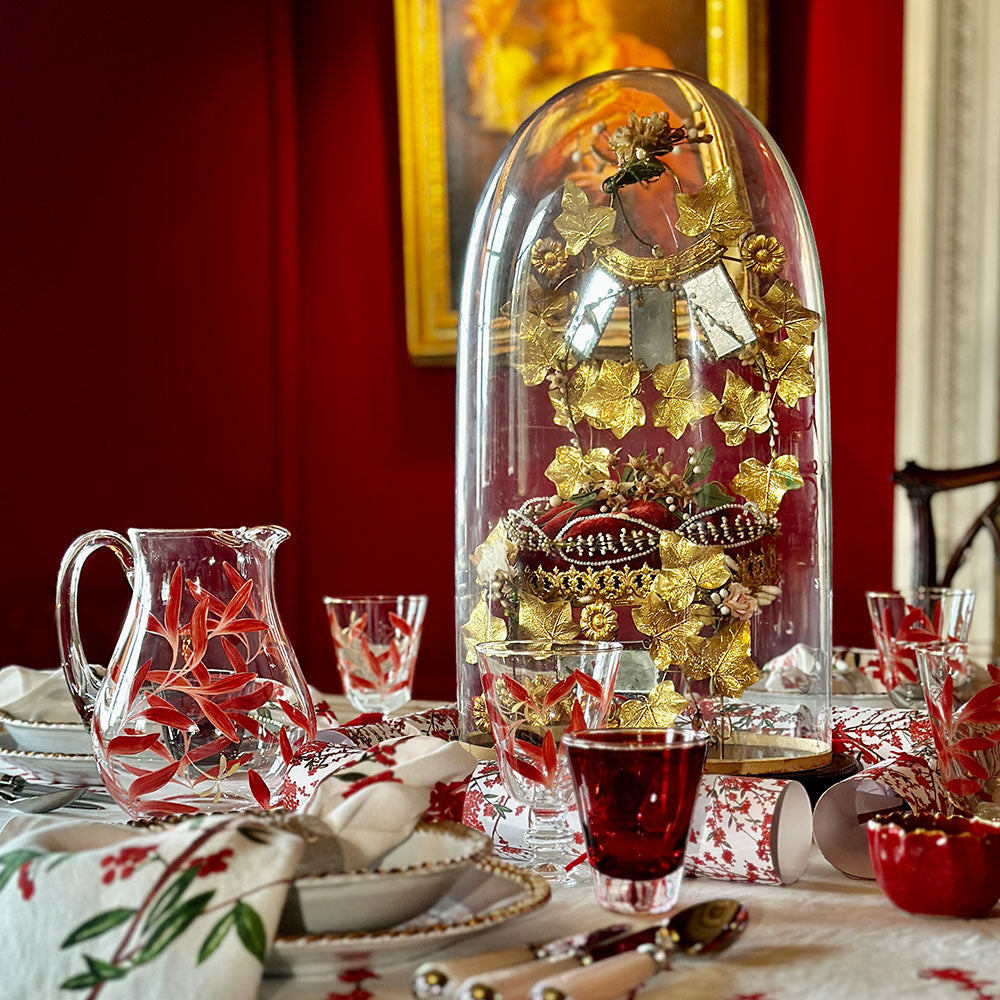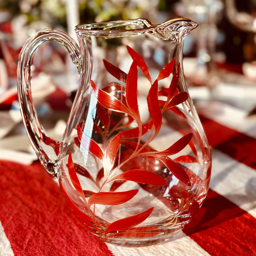 A true statement of artistry and craftsmanship, this burgundy glass jug is hand-finished with a shimmering 24kt gold dragonfly. Perfect for serving water, wine, or fresh flowers, it brings a sense of enchantment and elegance to any setting.