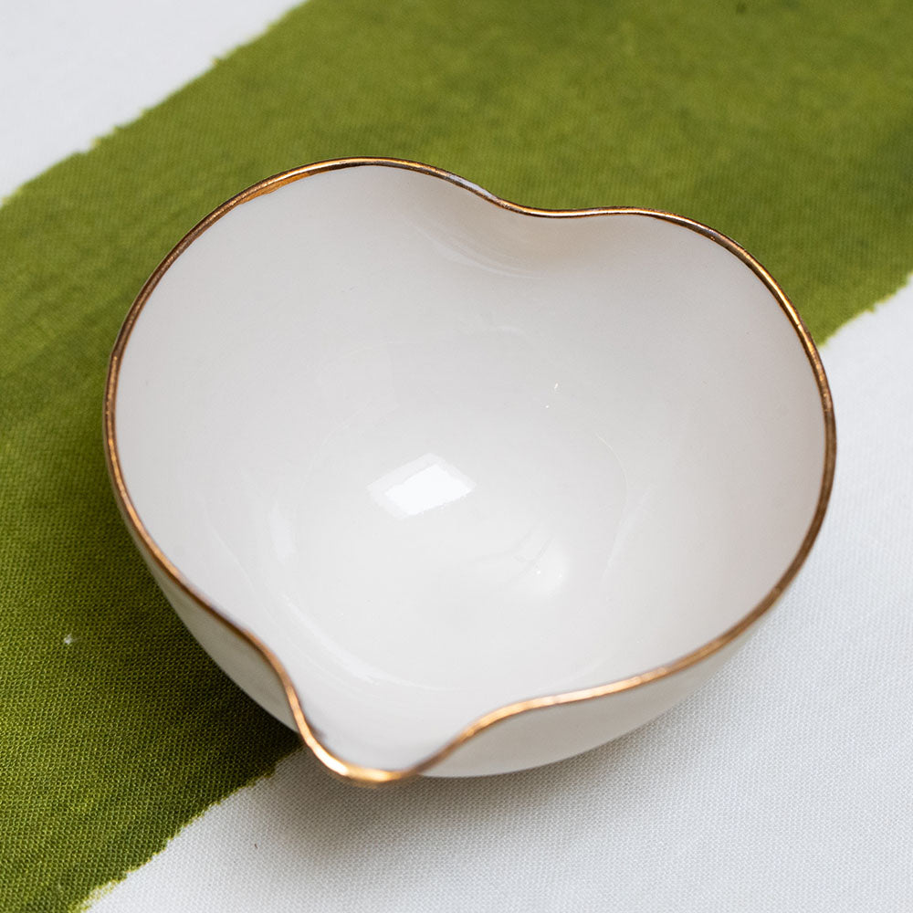 Delicate and timeless, this extra-small porcelain heart bowl features a fine gold rim and a soft ivory glaze. A lovely keepsake for salt, sauces, or tokens of love.