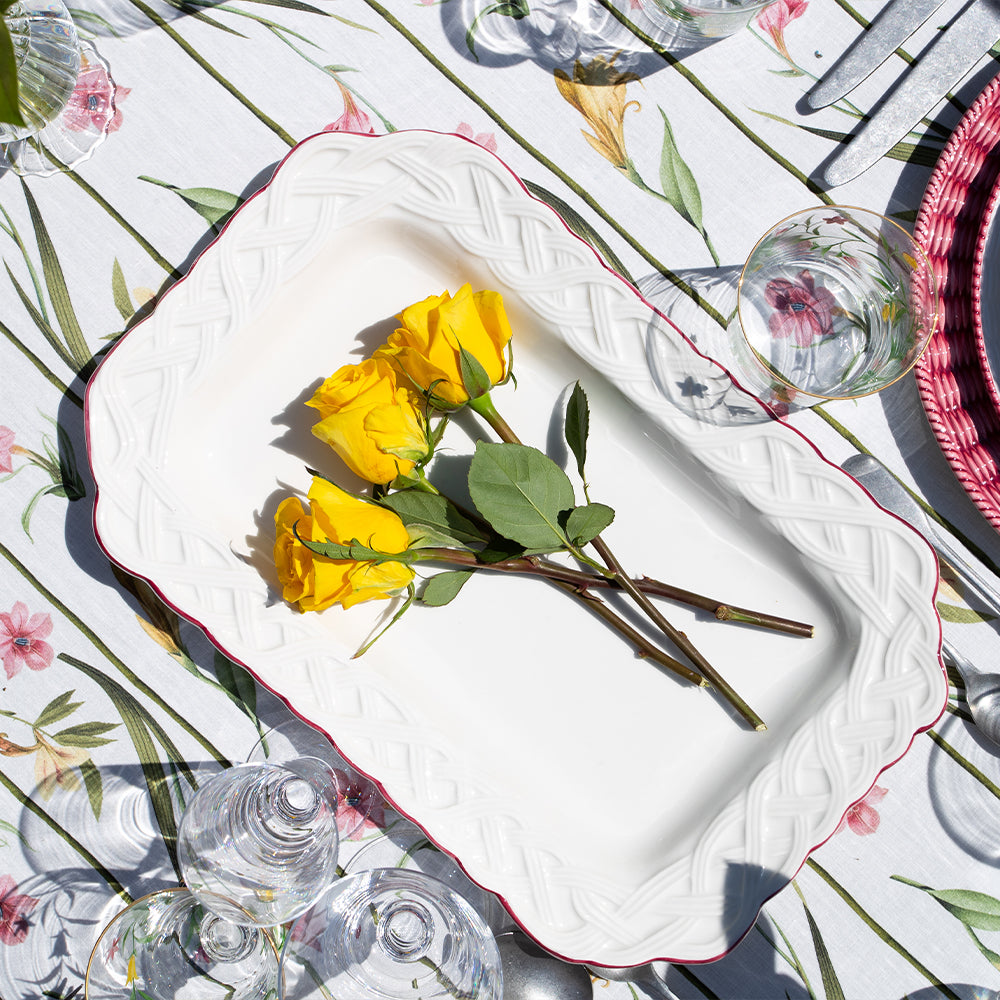 Handmade and hand-painted in Italy, this White and Bordeaux Rectangle Platter showcases exquisite craftsmanship and a warm, inviting colour palette. Its elegant design adds a sophisticated touch to any dining setting. Pair it with the matching Bordeaux Dinner service to create a beautifully coordinated and welcoming tablescape.