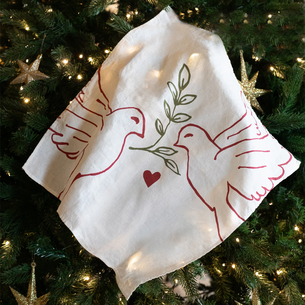 A pair of expressive doves in fluid strokes, with a beautiful red heart and olive branch, grace this 100% French linen napkin. The perfect accessory for setting intentions for peaceful & harmonious family gatherings this festive season.