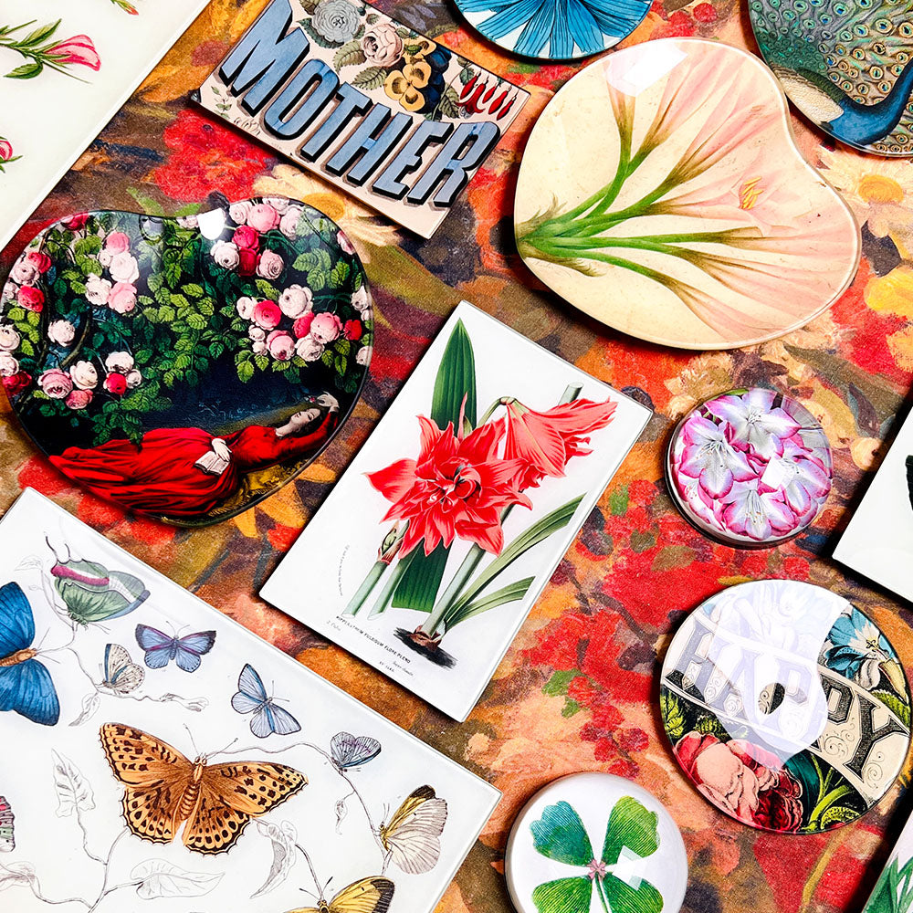 Please Note: each decoupage glass piece is handcrafted in John Derian’s studio using archival imagery and sealed for everyday display; wipe clean with a soft, damp cloth.