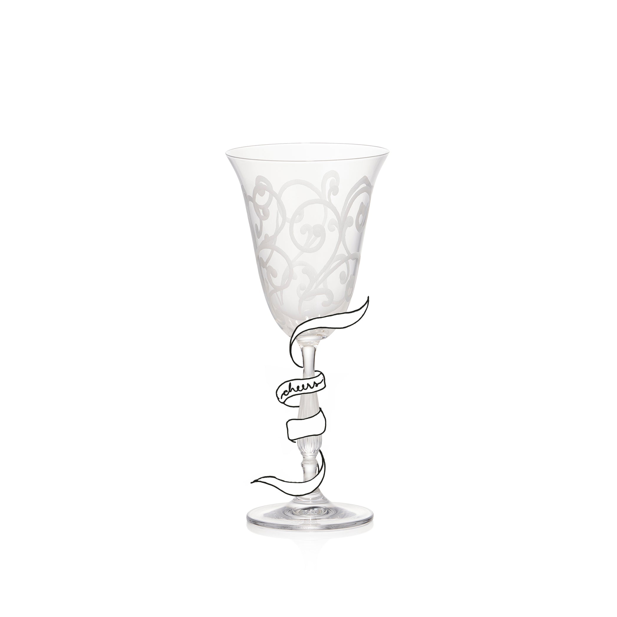 ... Read moreA hand engraved white wine glass with a swirling pattern of ribbons. The ribbons are intended to emulate movement, music rhythm and sinuous choreography.