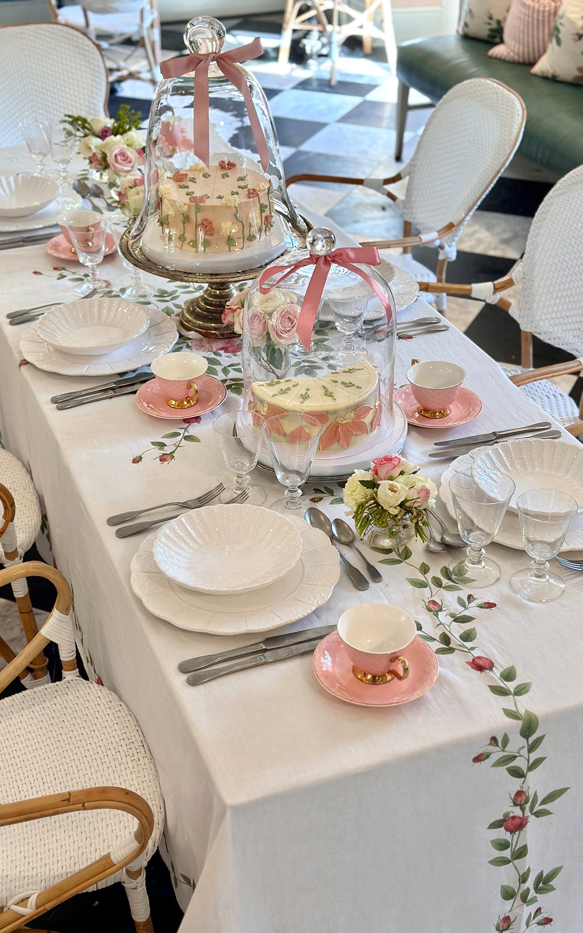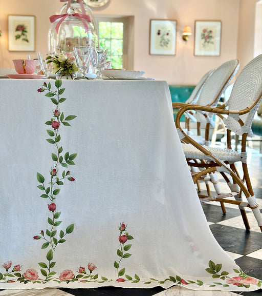Inspired by the graceful beauty of climbing roses, the Rose Trellis design features delicate blooms entwined with lush greenery, evoking the romantic charm of secret gardens. Hand-painted with flowing lines and soft movement, it brings depth and elegance to the table. Crafted from 100% pure French linen, the tablecloth and matching napkins suit both intimate dinners and larger gatherings, indoors or out - offering a timeless, garden-inspired setting for every occasion.
