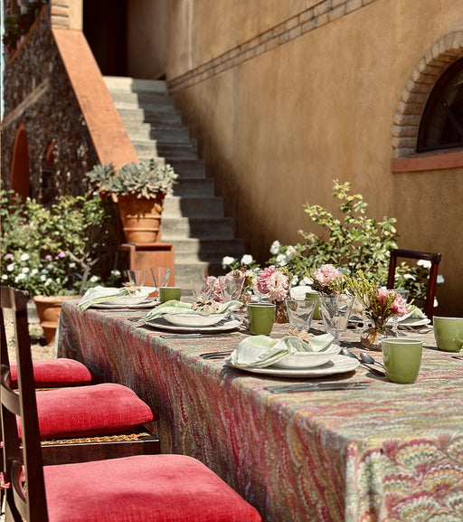 An evocative and timeless marble design brought to life in elegant shades of pink, green, and yellow. The swirling, painterly pattern creates a mesmerising effect, capturing the fluid beauty of natural stone while adding a contemporary touch to your table. Crafted from 100% pure linen, this tablecloth and matching napkins transforms any meal into an extraordinary occasion, captivating your guests with its unique artistry. Pair it with matching napkins for a cohesive and sophisticated look.