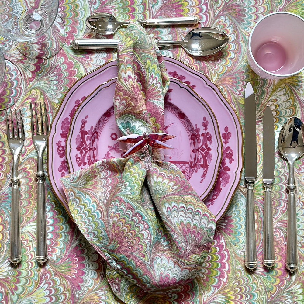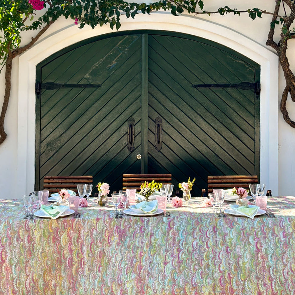 'Marble Fan' Linen Tablecloth in Pink, Green & Yellow