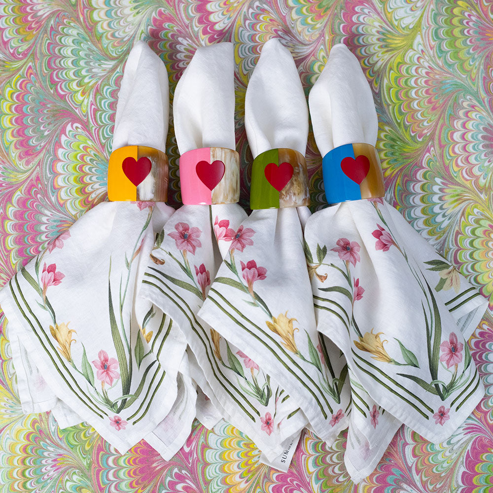 Handcrafted from natural horn and finished with a green lacquered band and red heart seal, this napkin ring brings a romantic flourish to the table. Charming on its own or mixed with other colours, it adds a playful touch to any setting.