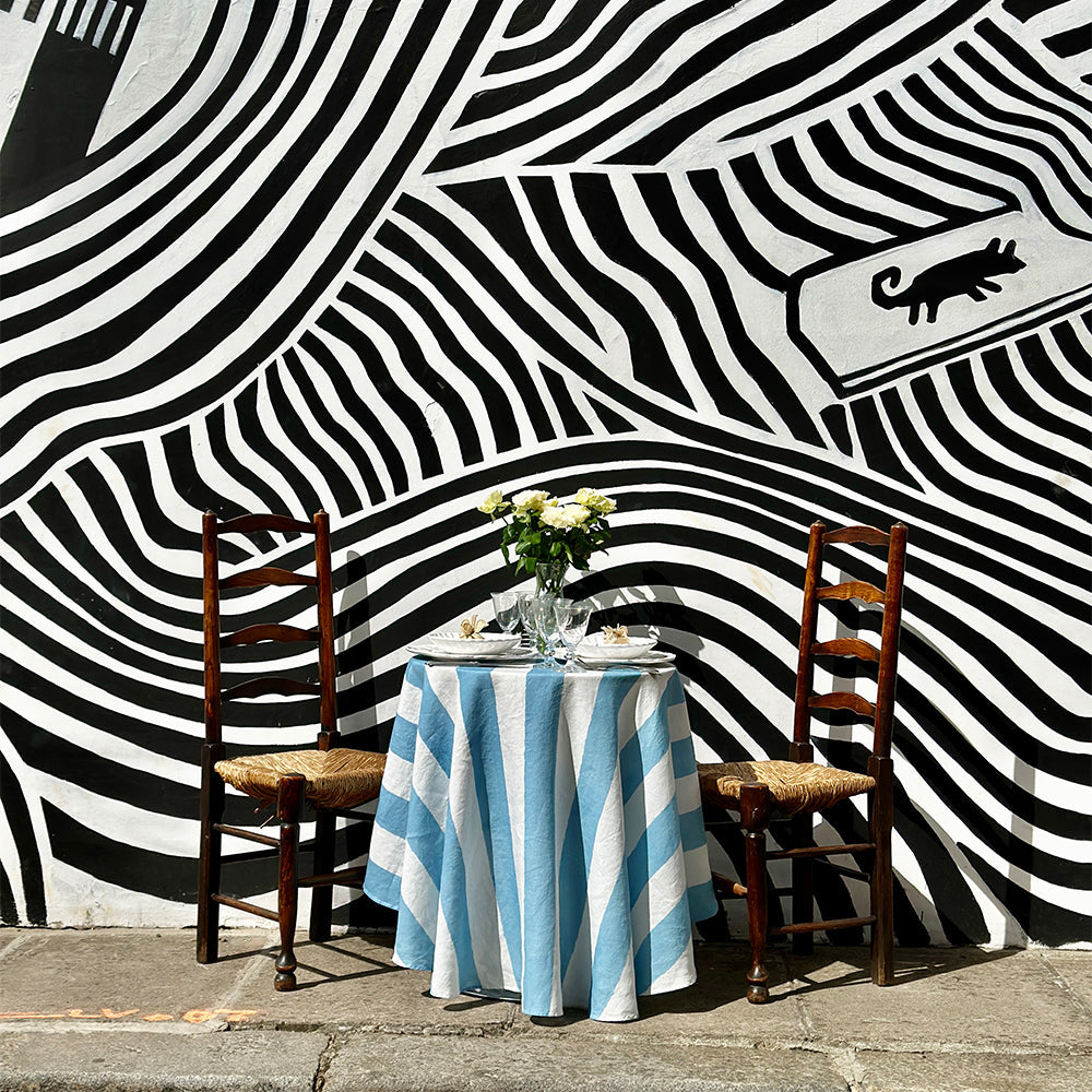 ... Read moreA small round occasional tablecloth featuring our iconic 'Stripe' design in soft pale blue, evoking the calm of sea and sky. Beyond the delicate linen stripes, imagine the sound of waves, sand beneath your feet, birdsong in the distance, and the scent of summer in the air, perfect for gathering around the table.