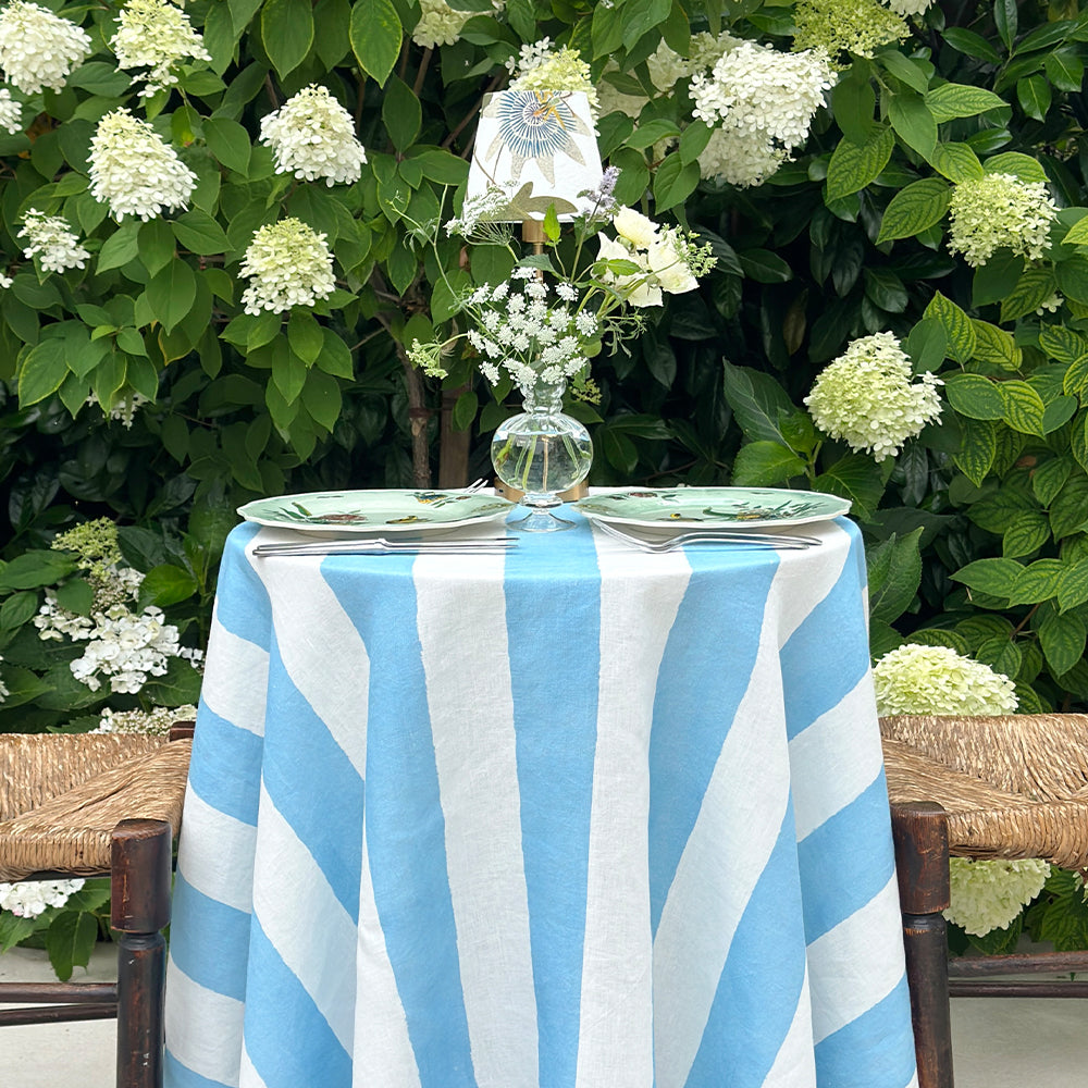 A small round occasional tablecloth featuring our iconic 'Stripe' design in soft pale blue, evoking the calm of sea and sky. Beyond the delicate linen stripes, imagine the sound of waves, sand beneath your feet, birdsong in the distance, and the scent of summer in the air, perfect for gathering around the table.