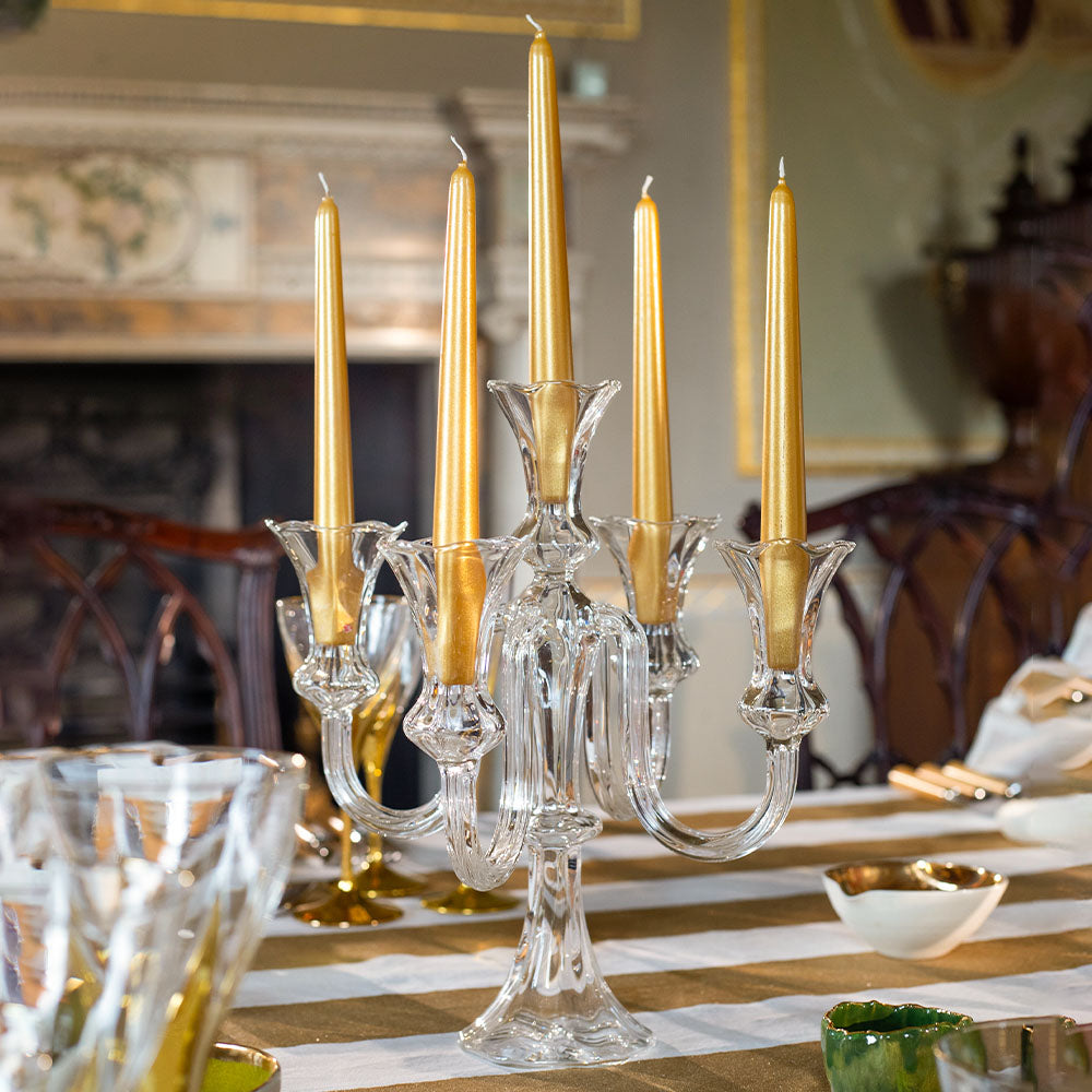 This pair of tapered church candles in Gold are beautifully handmade in Italy using the finest quality blended wax with a cotton wick, and finished with a gloss lacquered surface. Available in a range of colours created to complement our linens.The unscented candles will burn for 7 hours, giving off a steady flame to create a cosy and warming atmosphere for you and your guests.