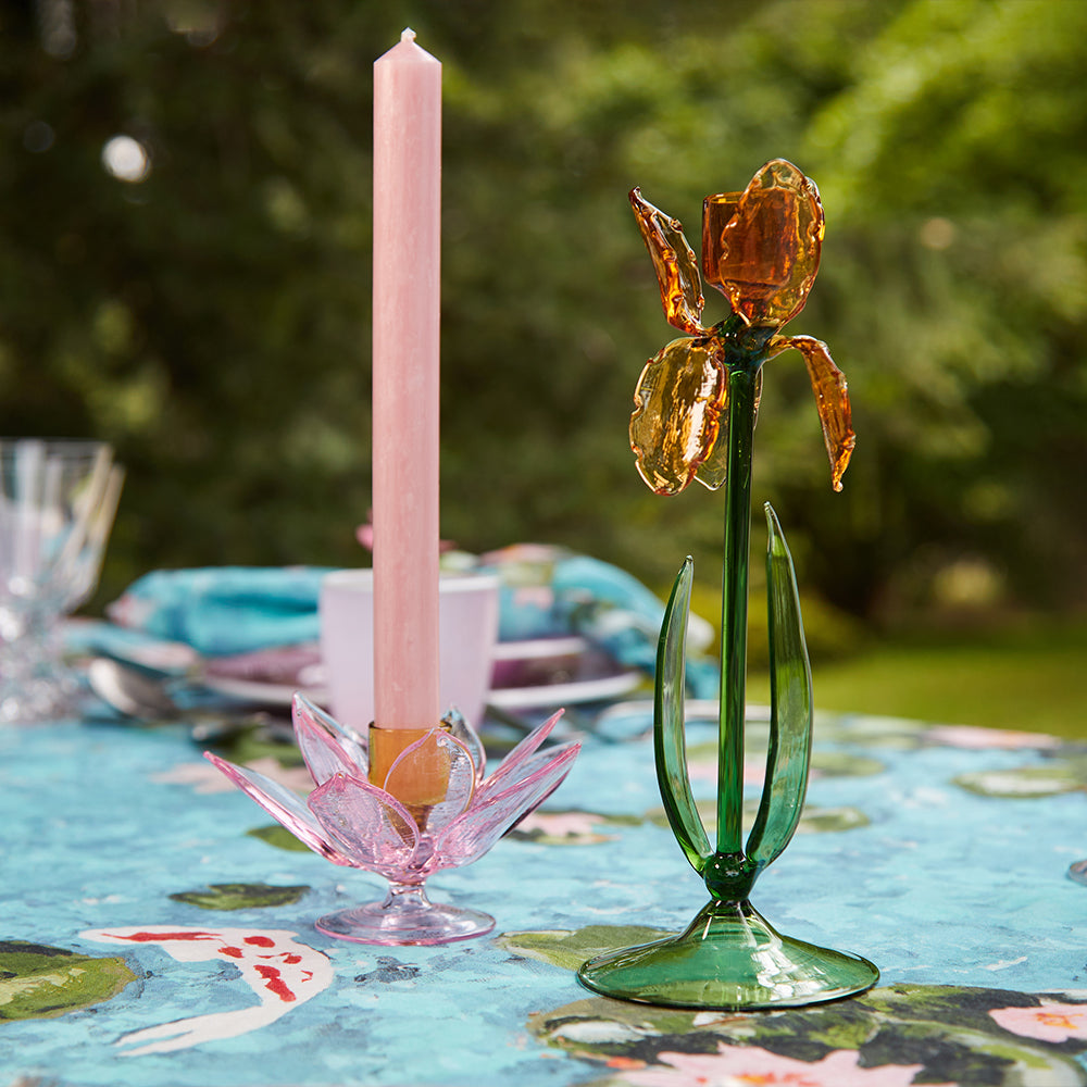 A Summerill & Bishop x Casarialto exclusive. An incredibly intricate lotus flower candlestick, handmade by master glassblowers, with vibrant pink and green accents to complement the most elegant of table settings and to celebrate the nuances of springtime nature. This stunning piece started as original artwork in our Notting Hill studio and was brought to creation by the artisans of Casarialto.