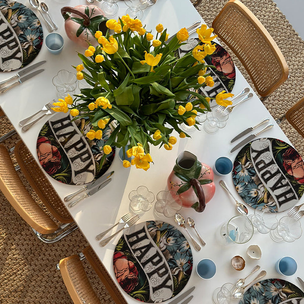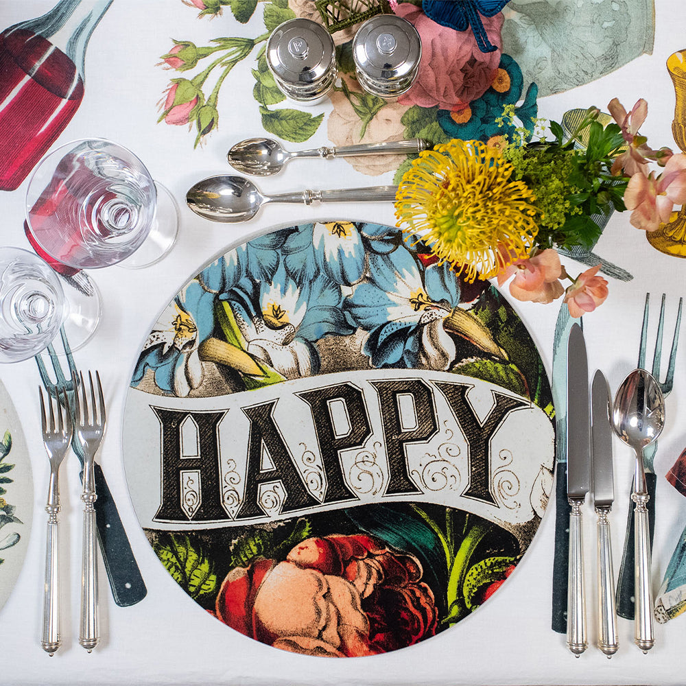The 'Happy' Round Placemat offers an uplifting addition to your table. With bold vintage typography sourced from John Derian’s celebrated imagery collection, this design adds a dash of humour and charm to your setting.