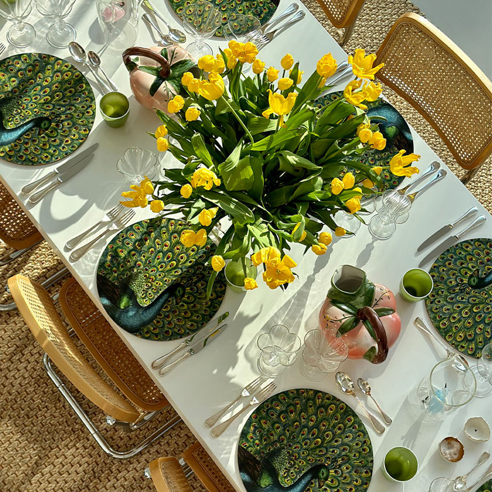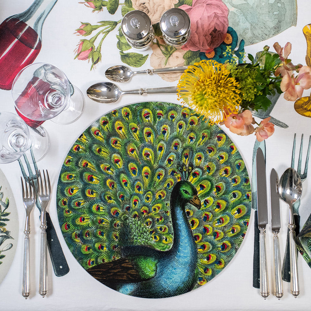 The 'Peacock' Round Placemat is full of life and grandeur, showcasing the bird’s intricate feathers in rich, vintage-inspired detail. Adapted from John Derian’s archive, this design brings a hint of the exotic to any table.