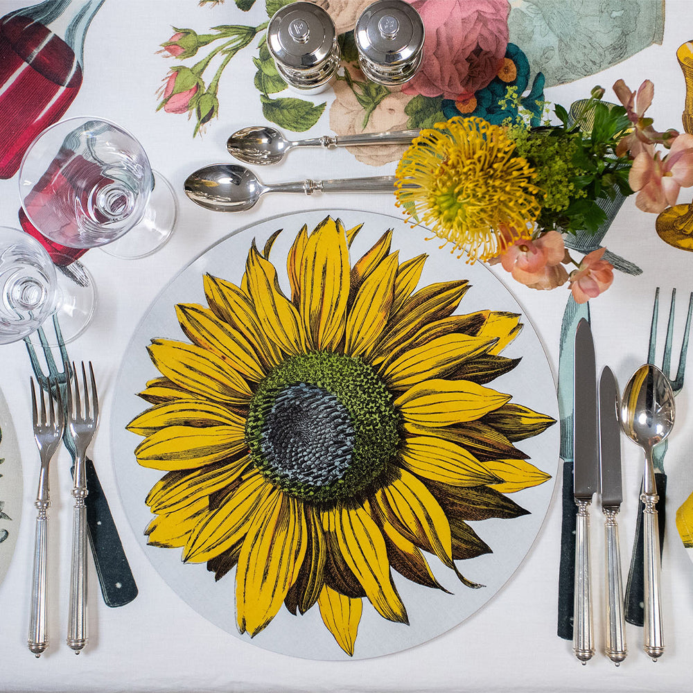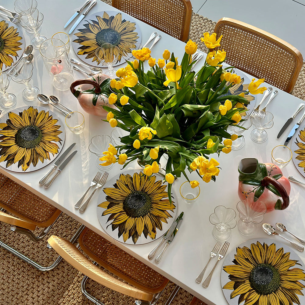Radiating warmth and golden hues, the 'Sunflower' Round Placemat channels the bold elegance of nature. Adapted from John Derian’s archive, this vintage-inspired botanical design brings rustic beauty and brightness to the table.