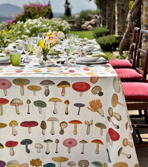 Reimagined from 18th and 19th century illustrations in John Derian's extensive archive, a vintage array of mushrooms dance across this spirited table linen in riotous shades. Set on a fresh white, formed as a kaleidoscopic vision of nature's edible forest floor finds.