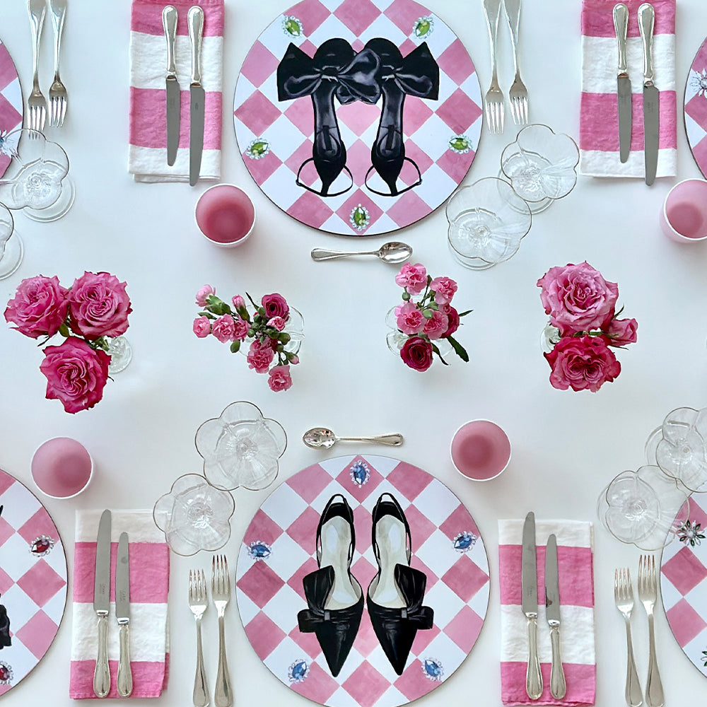 Set of 6 Shoe Check & Crystal Round Cork-Backed Placemats in Rose Pink, 34cm