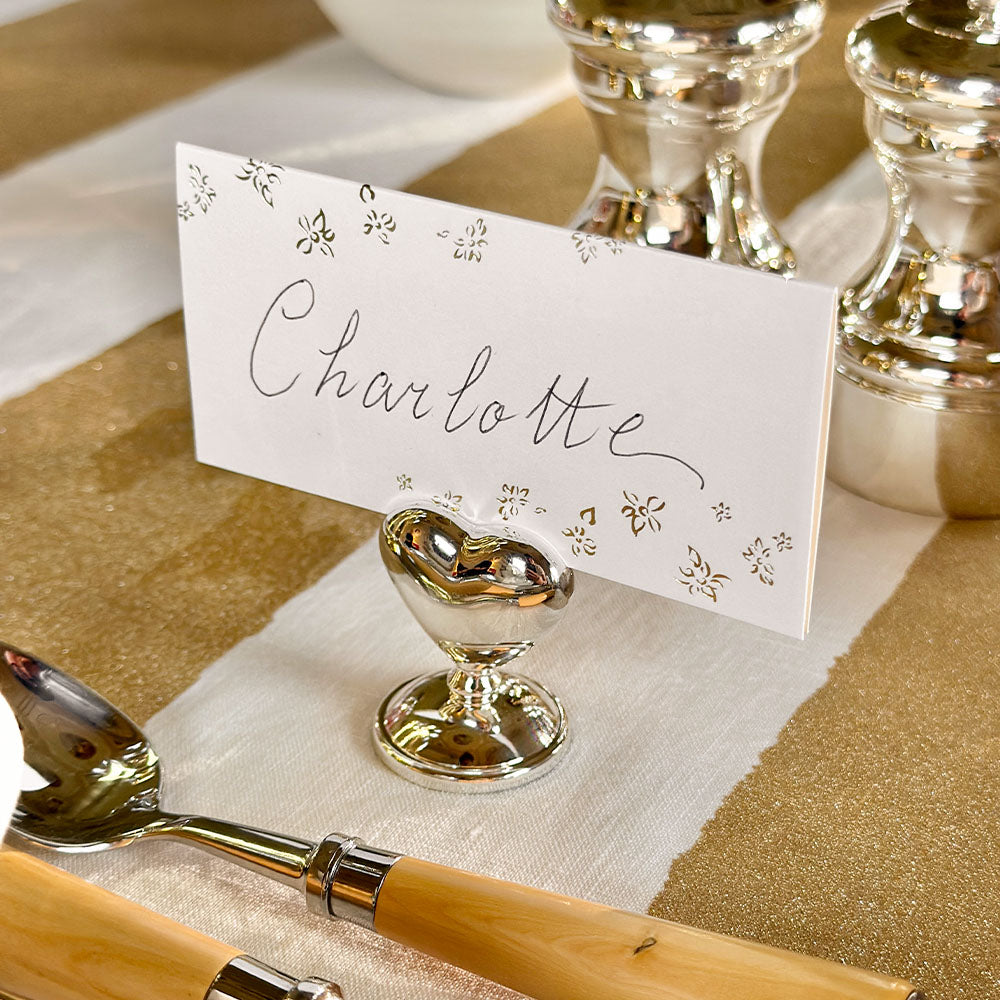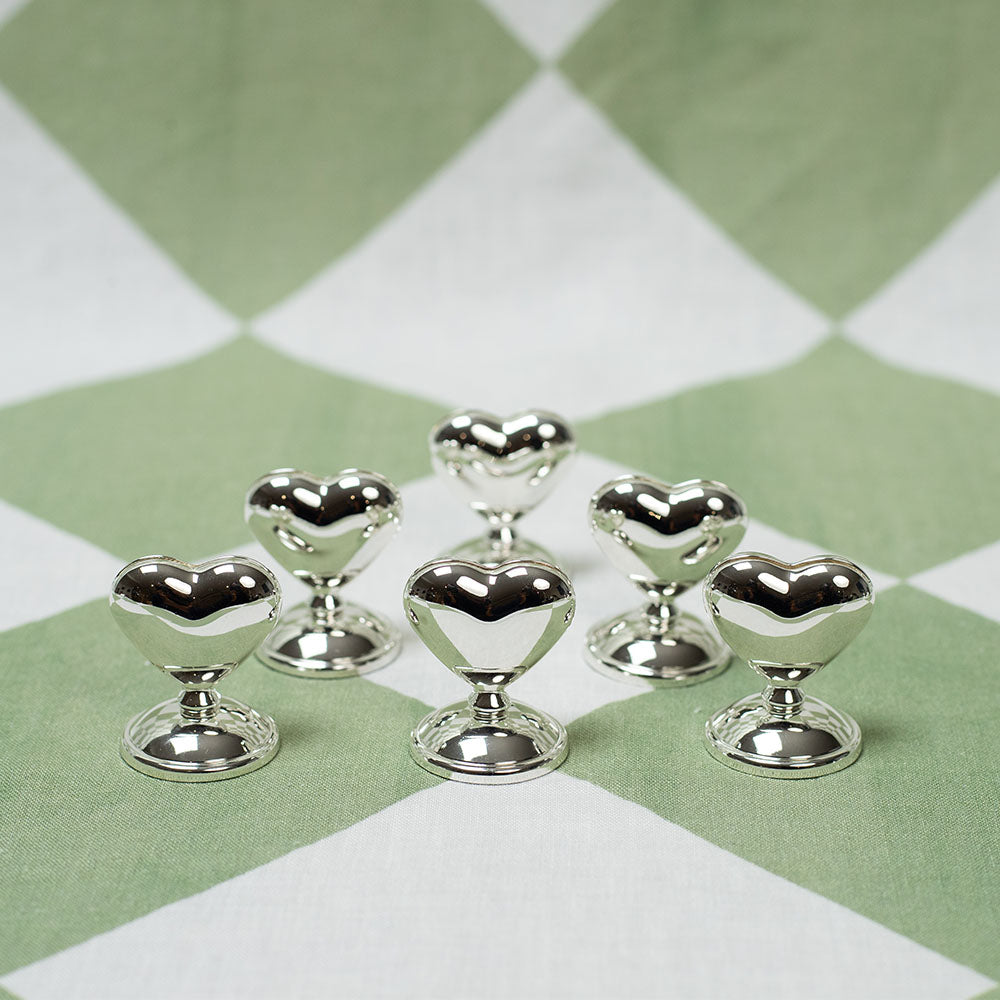 Bring charm and refinement to the table with this set of six heart-shaped silver-plated placecard holders. Perfect for weddings, dinner parties, or celebratory gatherings, they combine practicality with timeless romance.
