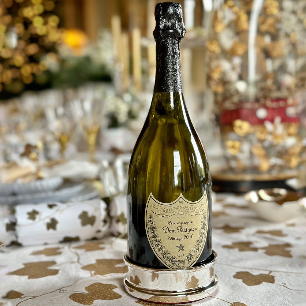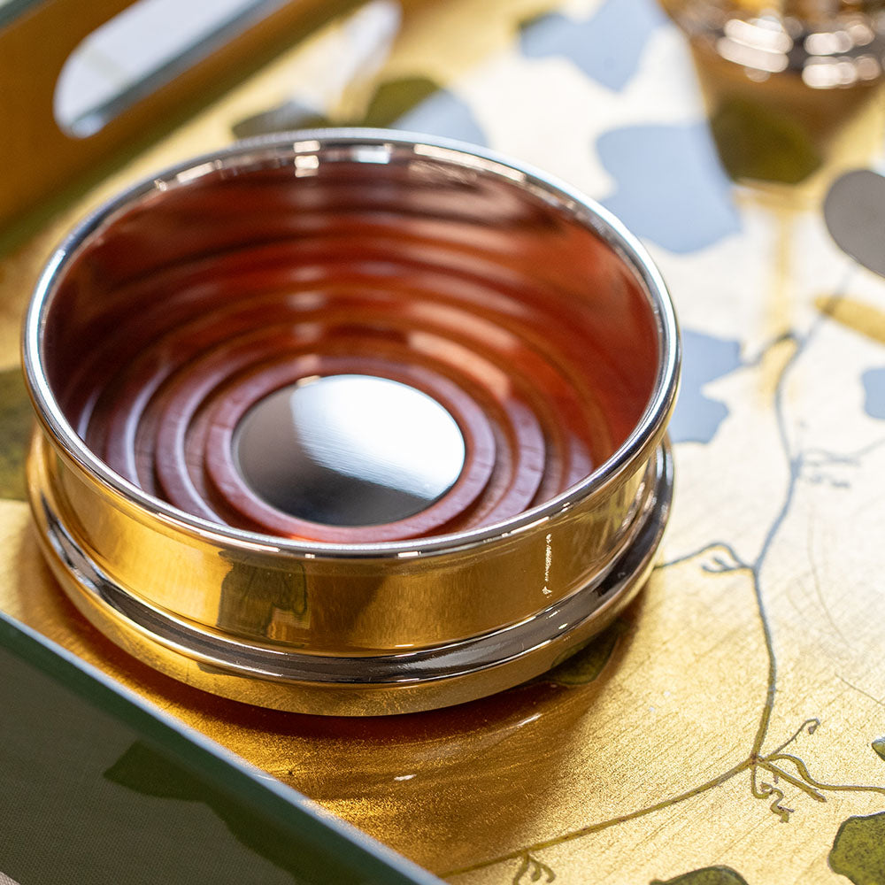 Protect your table with style: the silver-plated bottle coaster is finished with a natural wood base, blending classic elegance with practicality. An essential detail for wine service or celebratory occasions.